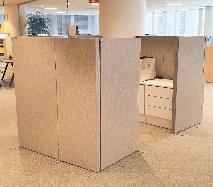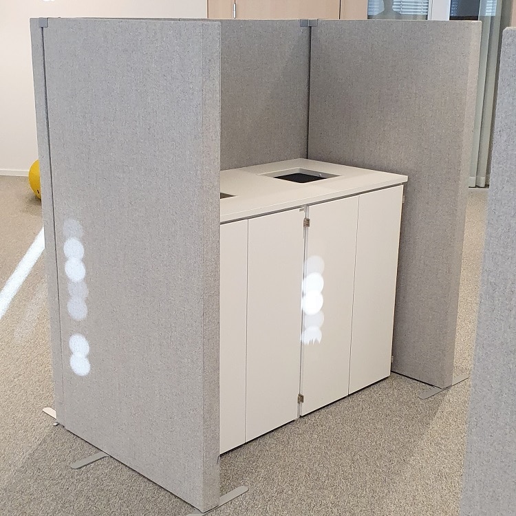 De två grå textilbåsen kommer från Zilenzio och är suveräna när man vill skapa en behaglig ljudnivå på kontoret. Eftersom de inte släpper igenom så mycket ljud blir båset med förvaring den perfekta ytan för att ställa kontorets skrivare på. Det här blir en diskret mittpunkt där medarbetarna kan hämta utskrifter, kontorsmaterial eller kasta papper, utan att störa någon annan.