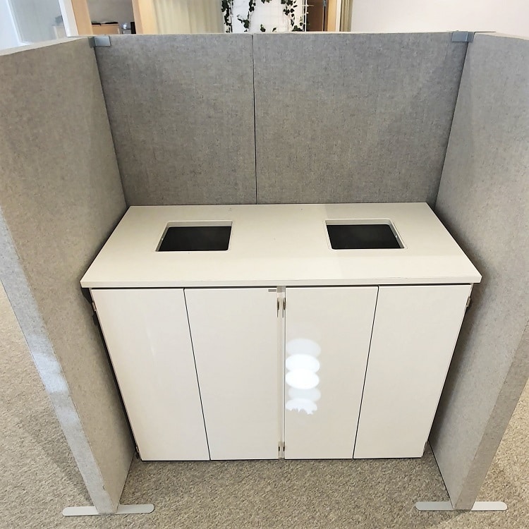 Nu har vi fått in en smart kontorslösning i form av två textilbås, den ena med två pappersåtervinningskärl och den andra med en förvaringsbänk – allt i ett komplett set!