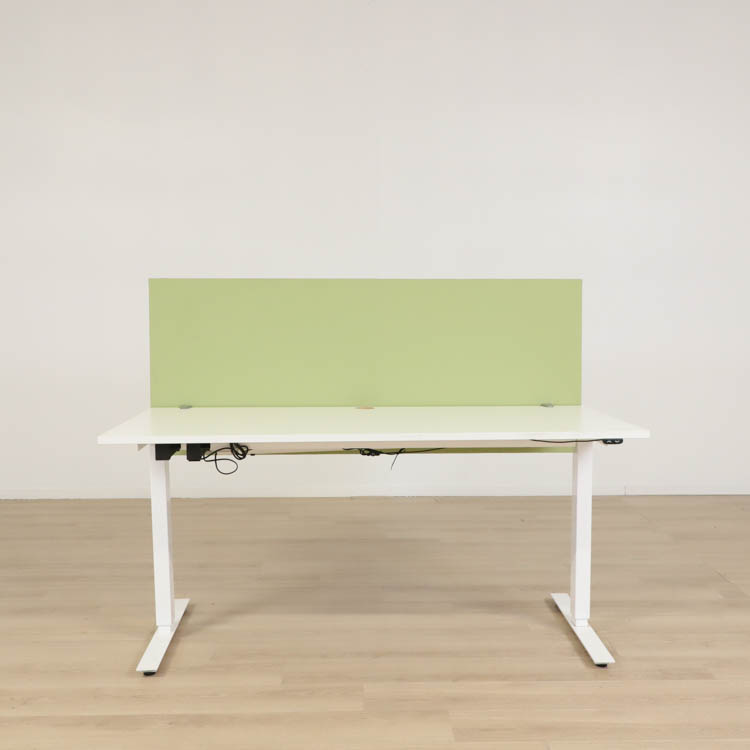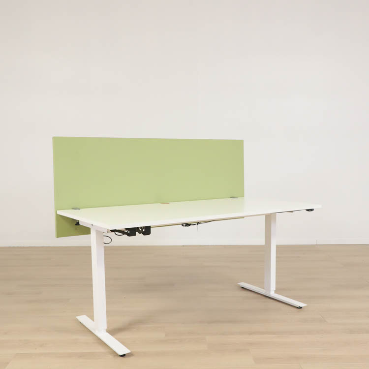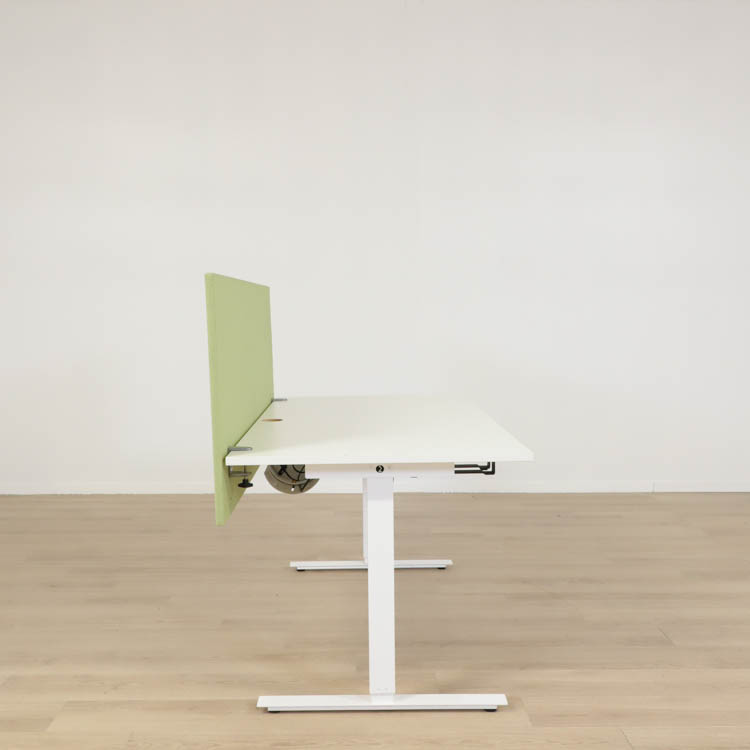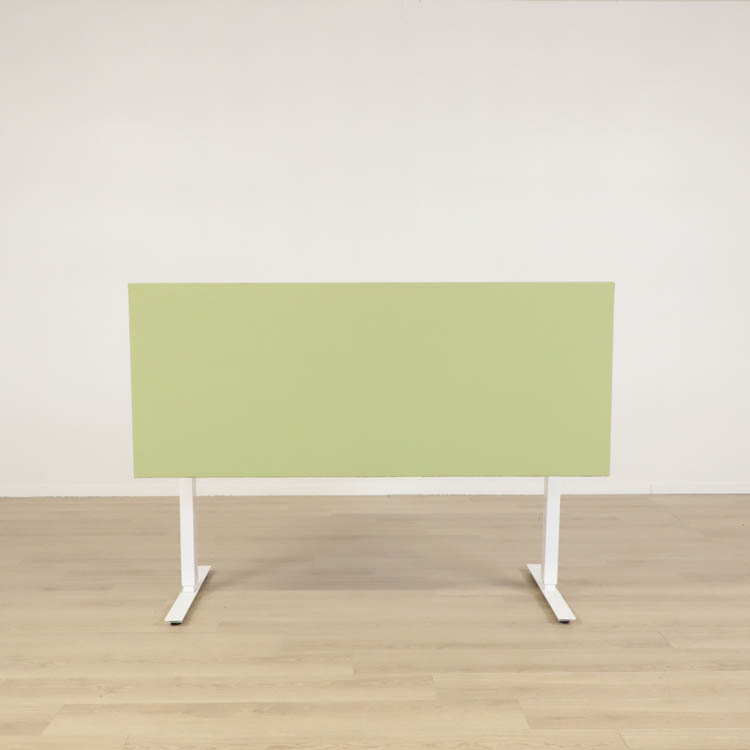 En funktionell och flexibel bordsskärm i grönt utförande, som dämpar ljud vilket optimerar arbetsklimatet och koncentrationsförmågan hos medarbetarna. Arbetar man i ett större kontorslandskap kan det vara mycket fördelaktigt med en bordsskärm vid sitt skrivbord för att enklare kunna arbeta ostört och koncentrerat. Bilden visar bordsskärm i måttet 160 cm.