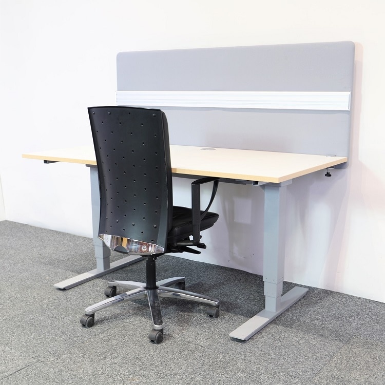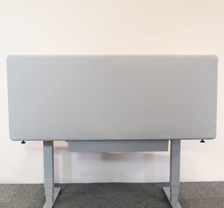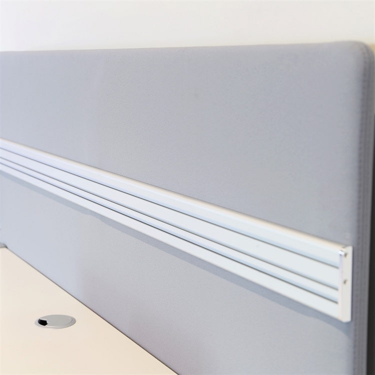Bordsskärmen i 160×65 cm kommer i ett mellangrått tyg.
