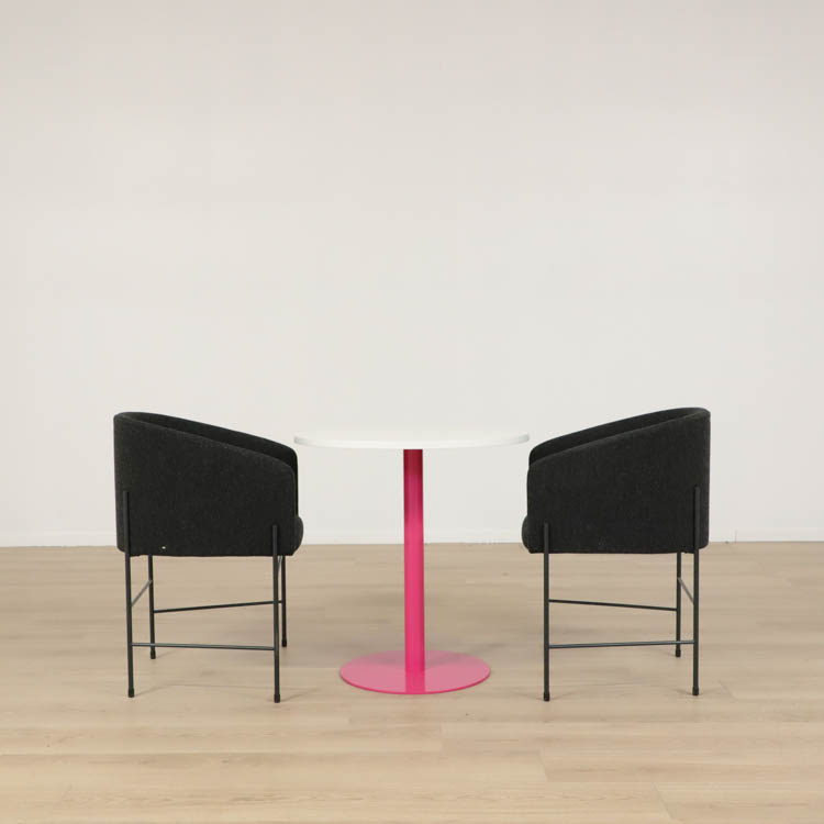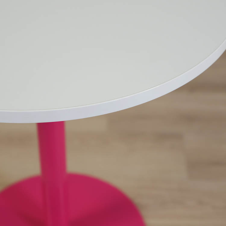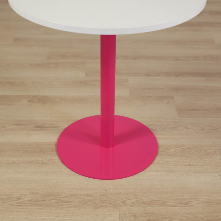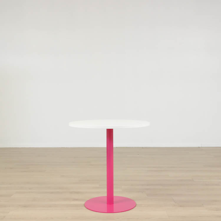 Här presenteras ett cafébord som fångar ögonen och lockar besökare från alla håll. Med en vit skiva och en färgglad pelarfot i rosa, utstrålar det en oemotståndlig charm och sofistikation.