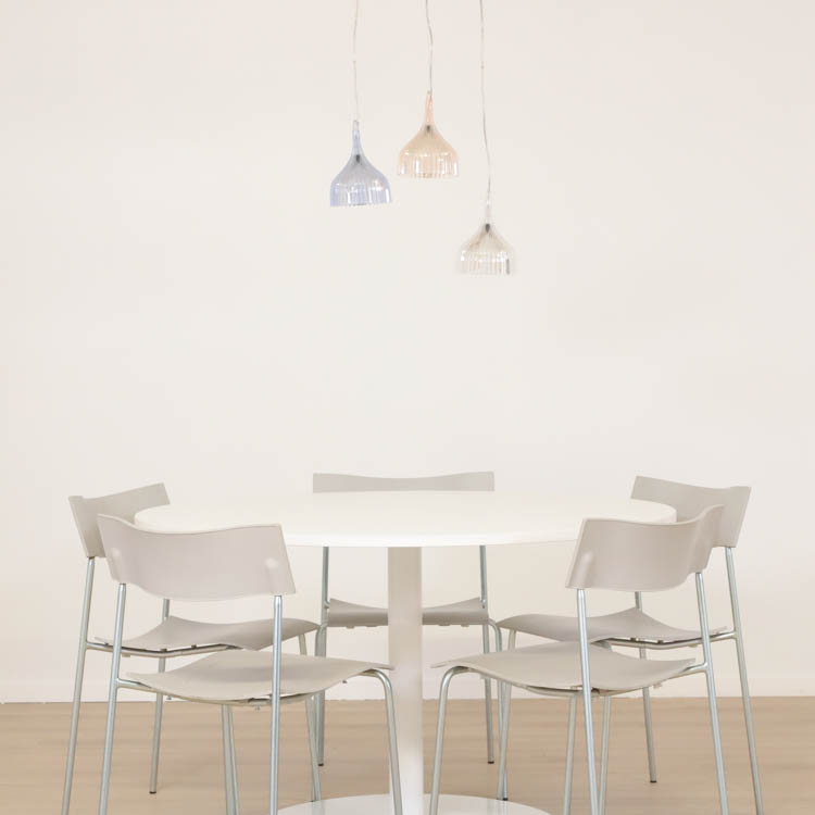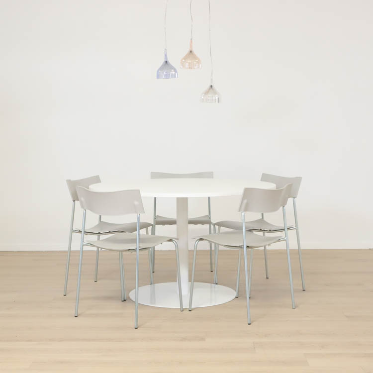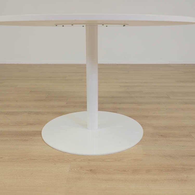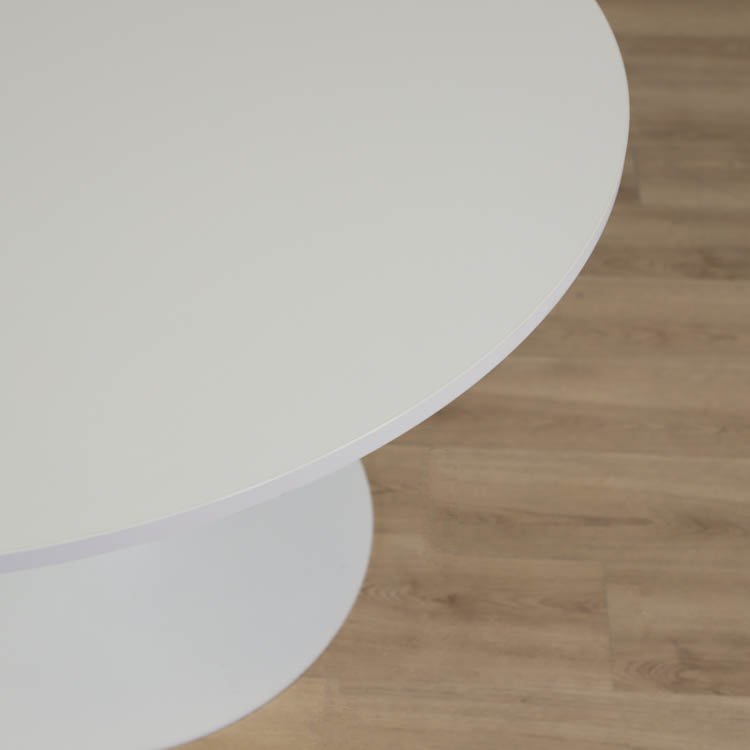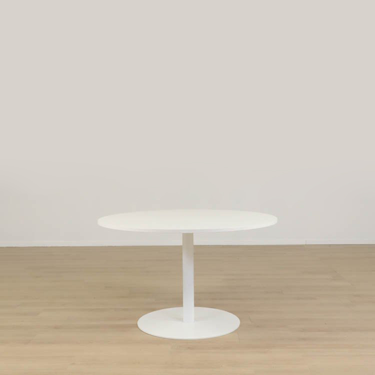 Här presenteras ett cafébord helt i vitt som utstrålar en sofistikerad och stilfullt uttryck. Dess enkla former gör bordet passande i matsalen på kontoret likväl som i köket hemma. Kanske är det här vid detta bord som vänner möts för att dela sina historier över en kopp kaffe eller där nya möten får ta form. Oavsett vem som sätter sig ned vid det, blir cafébordet en symbol för sammanhang och gemenskap på en plats där sociala samspel får äga rum.