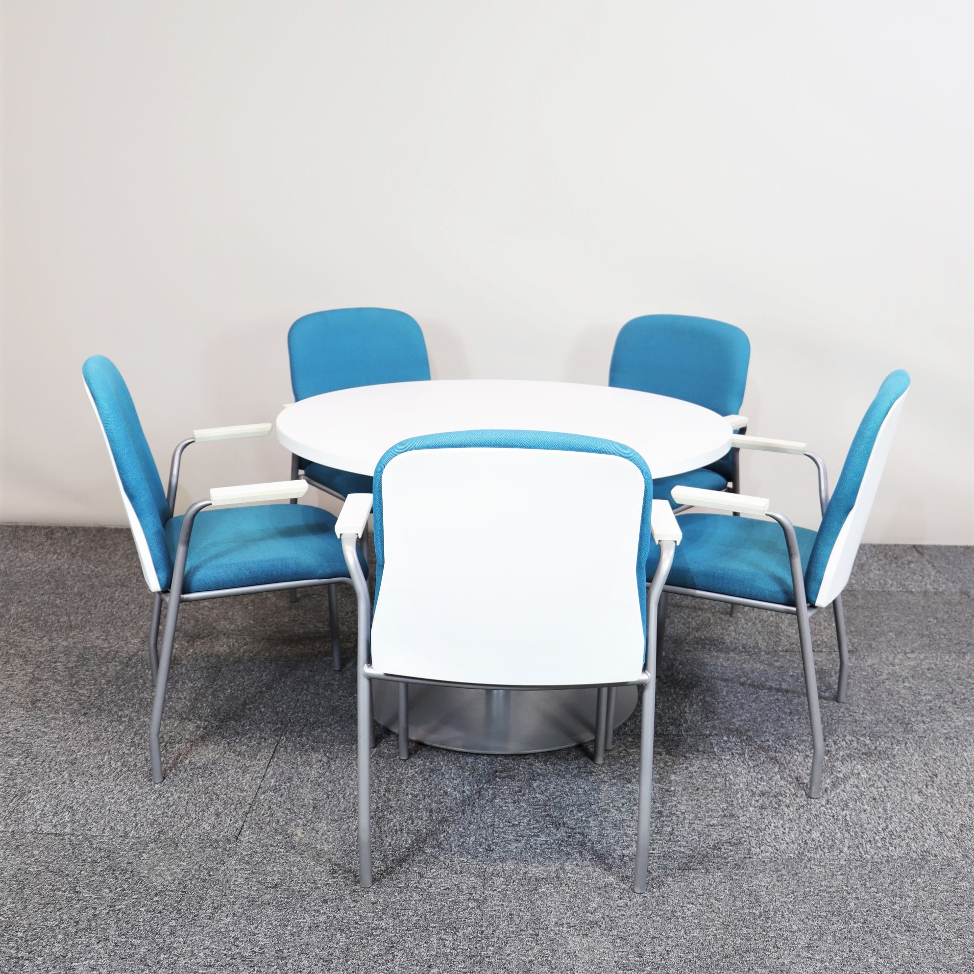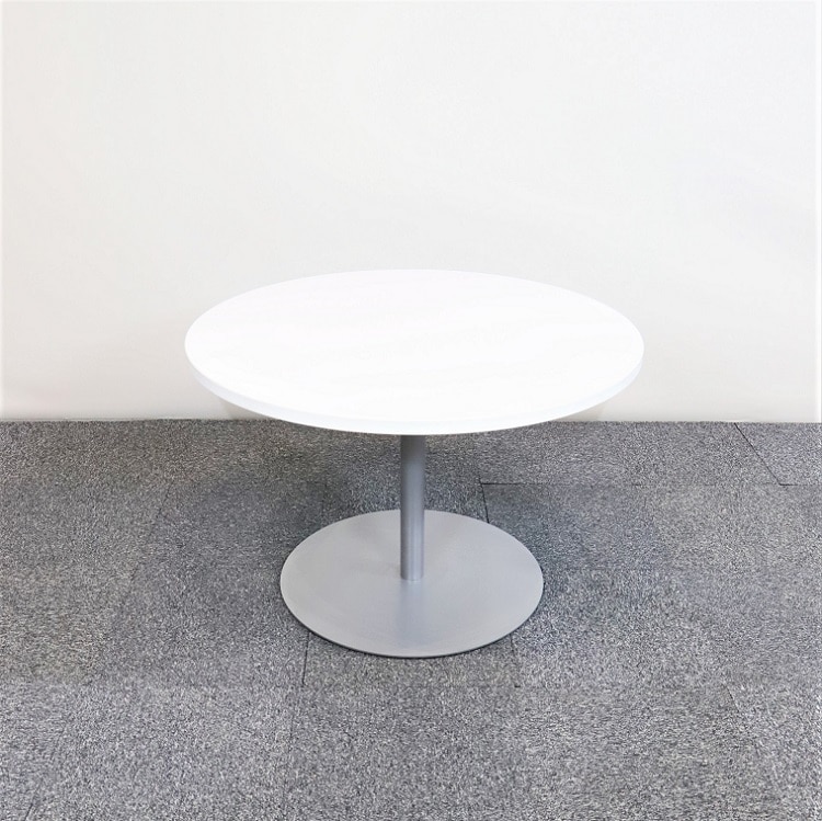 Runt och trevligt bord som funkar lika bra i personalmatsalen som i mötesrummet. En vit laminerad skiva som är lätt att hålla ren och en metallfot med pulverlackering. Plats för 4-5 personer.
