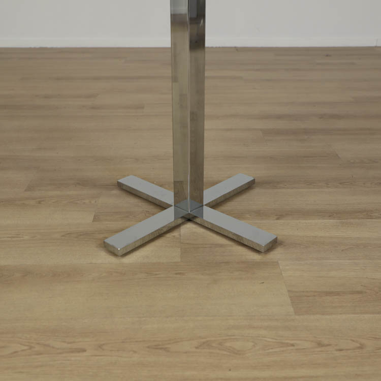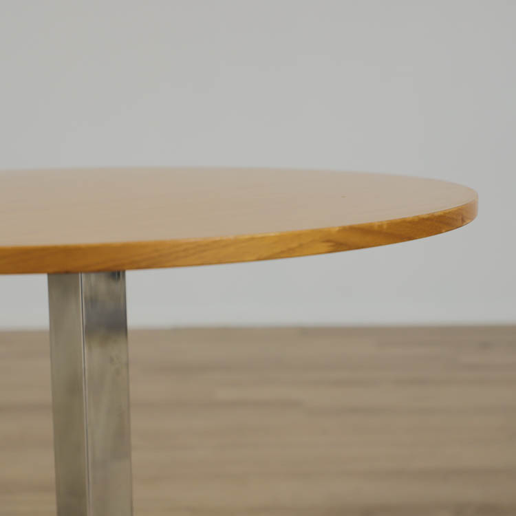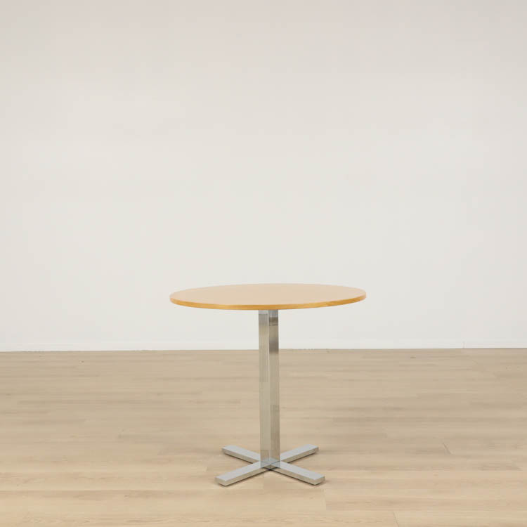 Ett runt cafébord i kvistfri träskiva som förmedlar en hemtrevlig känsla och öppnar upp till trevliga samtal, värdefulla möten och mysiga fikastunder. Krysstativet gör bordet stabilt och snyggt på samma gång. Designat av Ragnars design och Johan Ragnar.