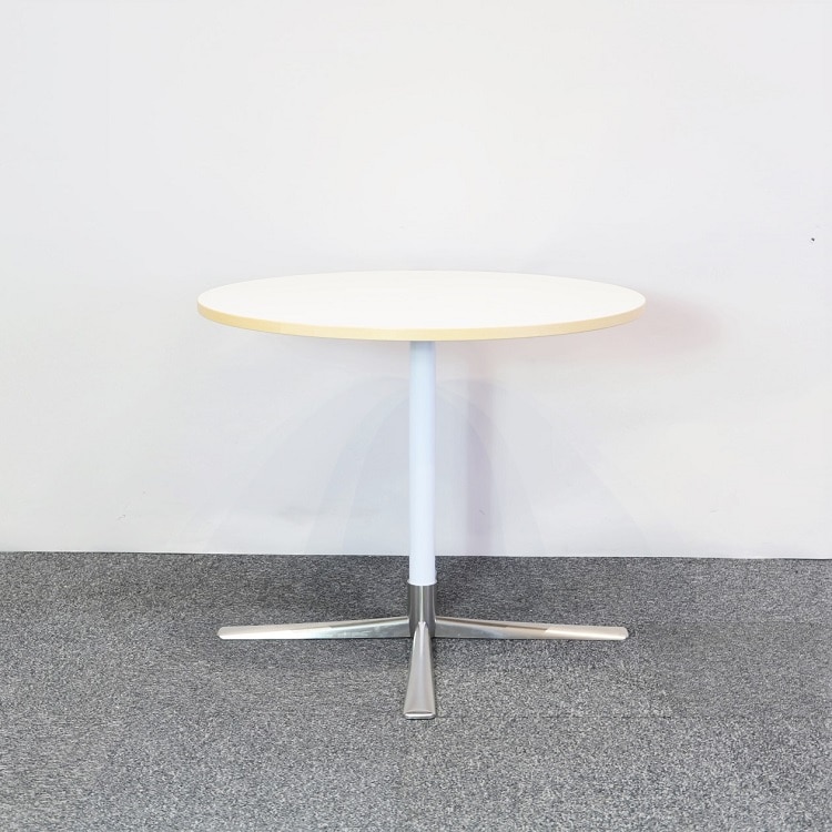 Runt cafébord från Gärsnäs med bordsskiva i vit kompaktlaminat och kantlist av trä. Ett tåligt bord med vitlackat pelarstativ och fotkryss i mattborstat rostfritt stål. Perfekt för cafémiljöer eller fikahörnor! Design av Åke Axelsson.
