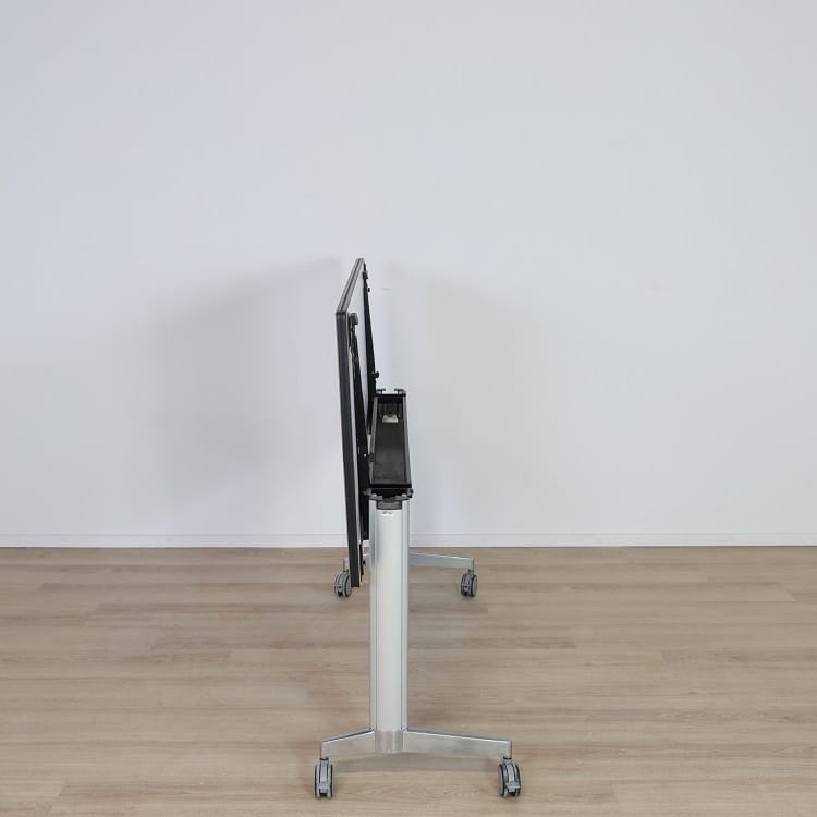 Ett flexibelt bord som du enkelt kan ta fram vid behov eller rulla bort när man inte behöver det. På ett par sekunder kan man förändra lokalen till en mötes- eller arbetsplats. Bordsskivan är dessutom fällbar och låses enkelt med reglaget så bordet tar ännu mindre plats när det inte används. Hjulen är låsbara och stativet är tillverkat av aluminium och bordsskivan av laminat för att uppnå maximal slitstyrka. Bordet rymmer upp till 4 sittplatser.