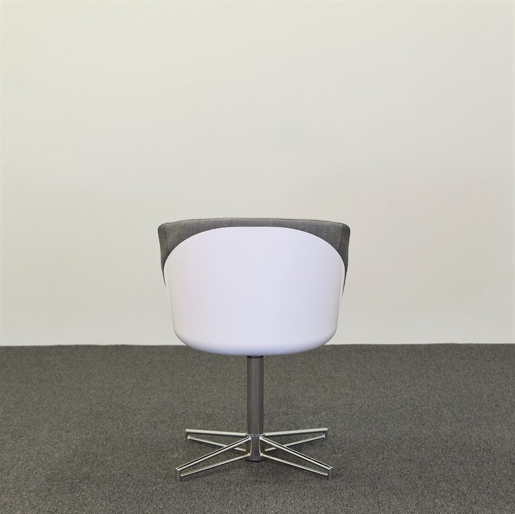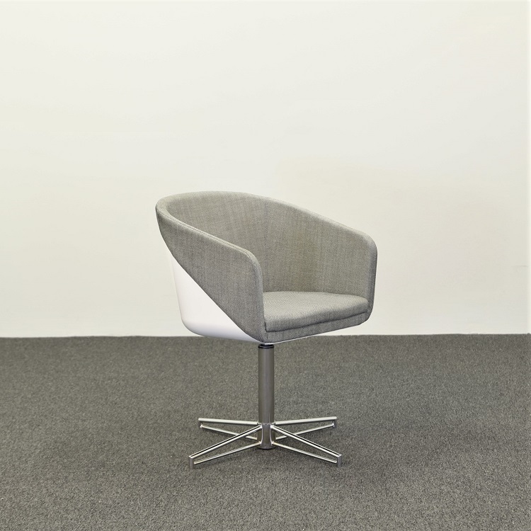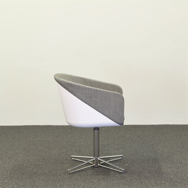 Elegant fåtölj med exklusiv utstrålning av formgivaren Alexander Lervik. Stoppad med kallskum och en högkvalitativt förkromat fyrkrysstativ. Stilrent grått tyg omfamnad av skalet i vitt som ljusar upp och på ett snyggt sätt bryter av mot den mörkare klädseln. Passar i de flesta miljöer som till exempel konferensrum, lounger, lobbys eller varför inte i hemmet?