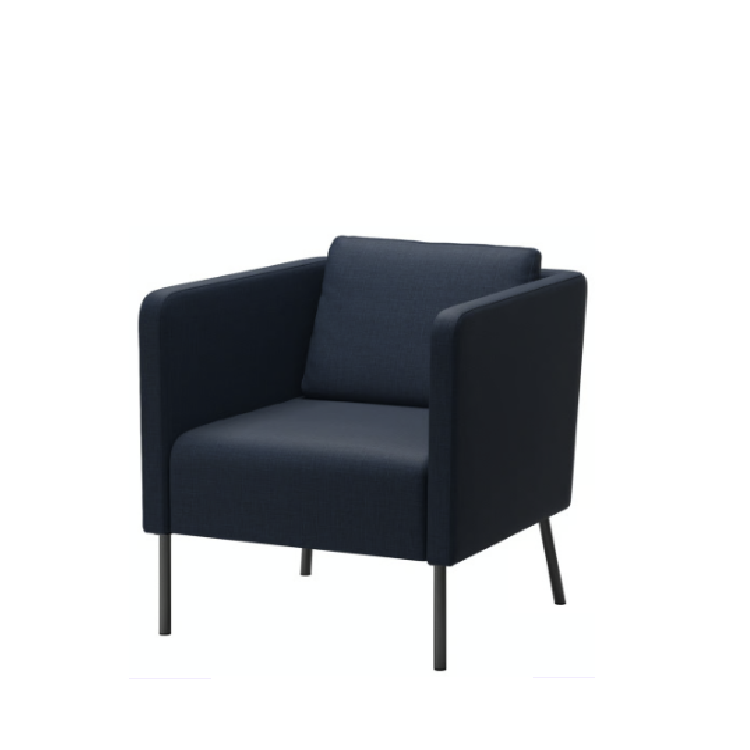 Fåtöljen Ekerö från IKEA har ett modernt uttryck och är ett stilfullt val för dem som söker en modern sittmöbel med god komfort och anpassningsbar design. Fåtöljen har två sidostycken som möts i ryggen, vilket ger ett inbyggt ländstöd för extra komfort. Här i ett slitstarkt mörkblått tyg med svarta ben.