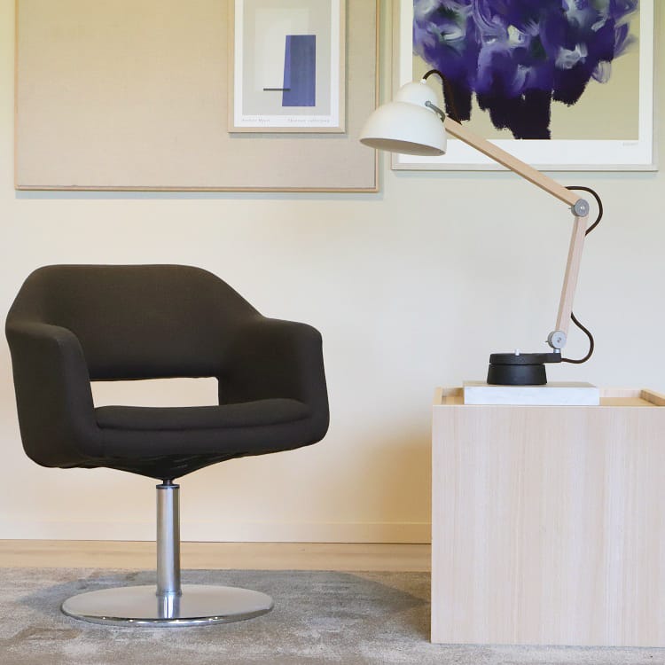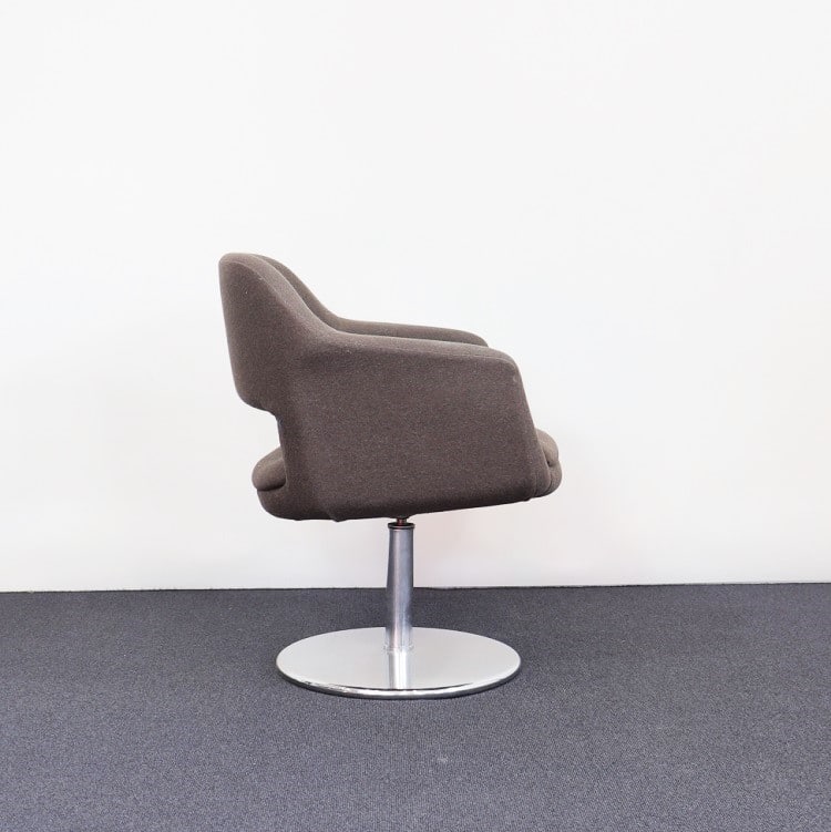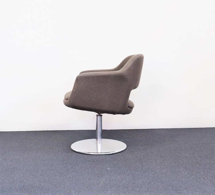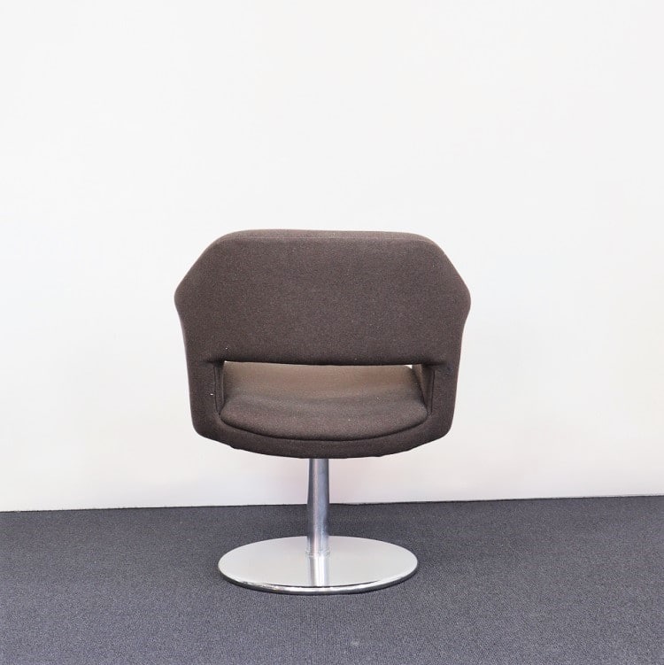 Largo från Johanson Design är en iögonfallande fåtölj klädd i brun-grå textil. Kromat stativ med rund fot som är möjlig att rotera i den ställning som passar.