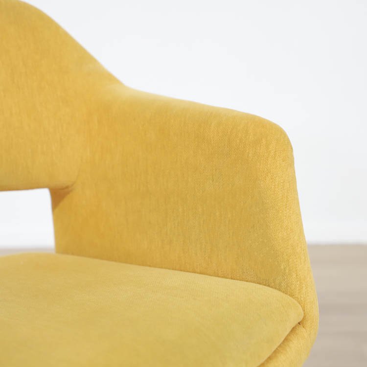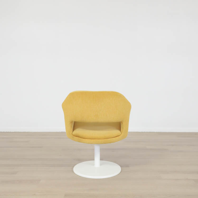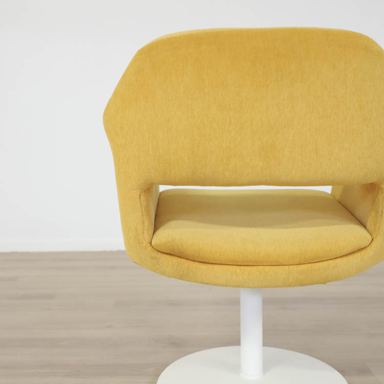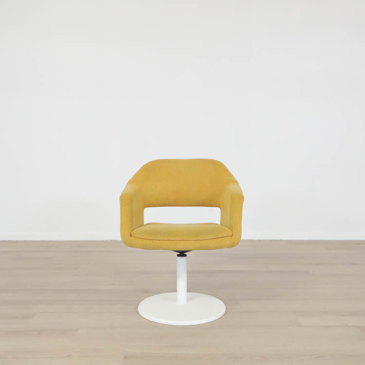 Largo från Johanson Design är en iögonfallande fåtölj klädd i senapsgul textil. Vitt stativ med rund fot som är möjlig att rotera i den ställning som passar. En fåtölj du kommer trivas i under långa sittningar under möten och andra tillställningar på kontoret, eller i loungedelen.