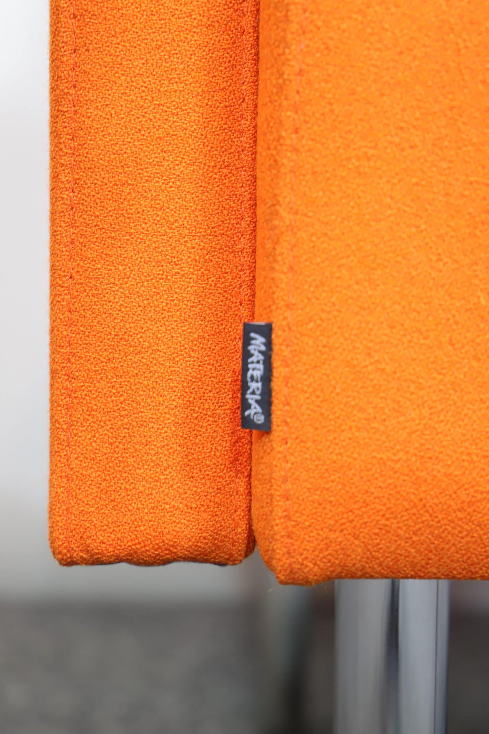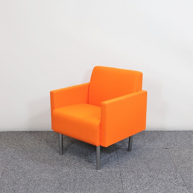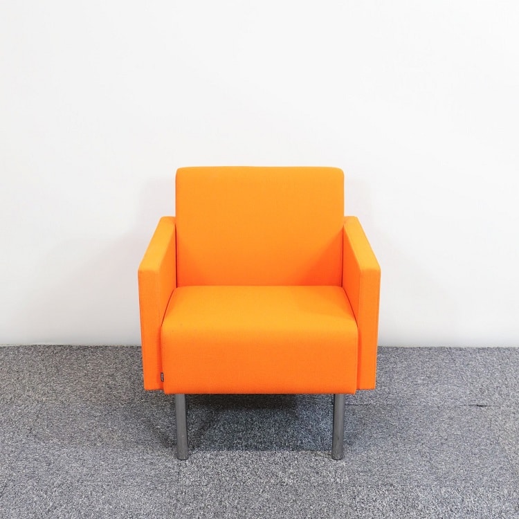 Monolite är fåtöljen som passar utmärkt i de flesta utrymmen, så som personalmatsalen eller väntrummet eftersom det mindre sittdjupet och högre sitthöjden erbjuder ett mer upprätt sittande. Den har en öppen utformning mellan sits och rygg som gör fåtöljen lätt att hålla ren. Här i ett ovanligt utförande med färgstark orange klädsel och 4-ben istället för standard medar.