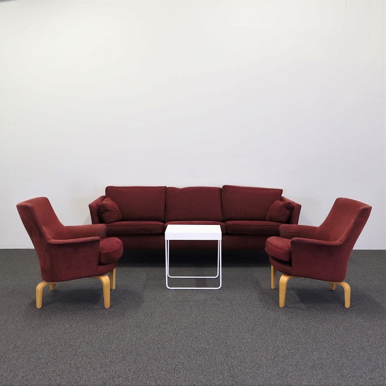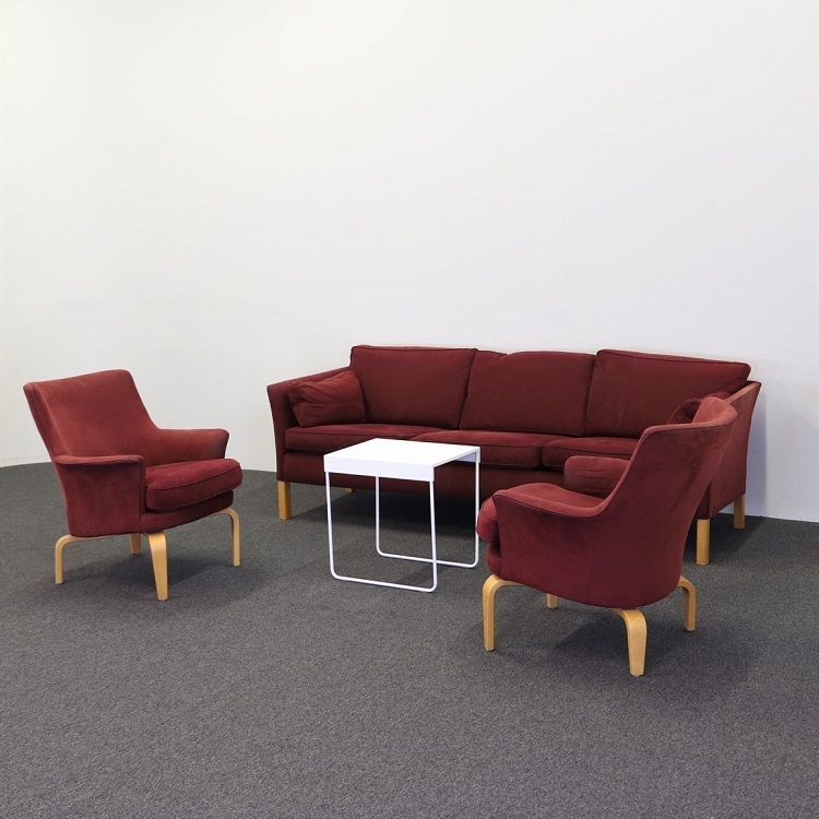 Fåtöljen Pilot formgavs år 1967 av Arne Norell. Ett exemplar bland klassikerna som känns som en tidlös investering. Här klädd i ett lite djupare rött tyg i mocka & ben i oljad ek. Matchas med fördel till soffan Cromwell i samma tyg Pilot, du hittar dem här.