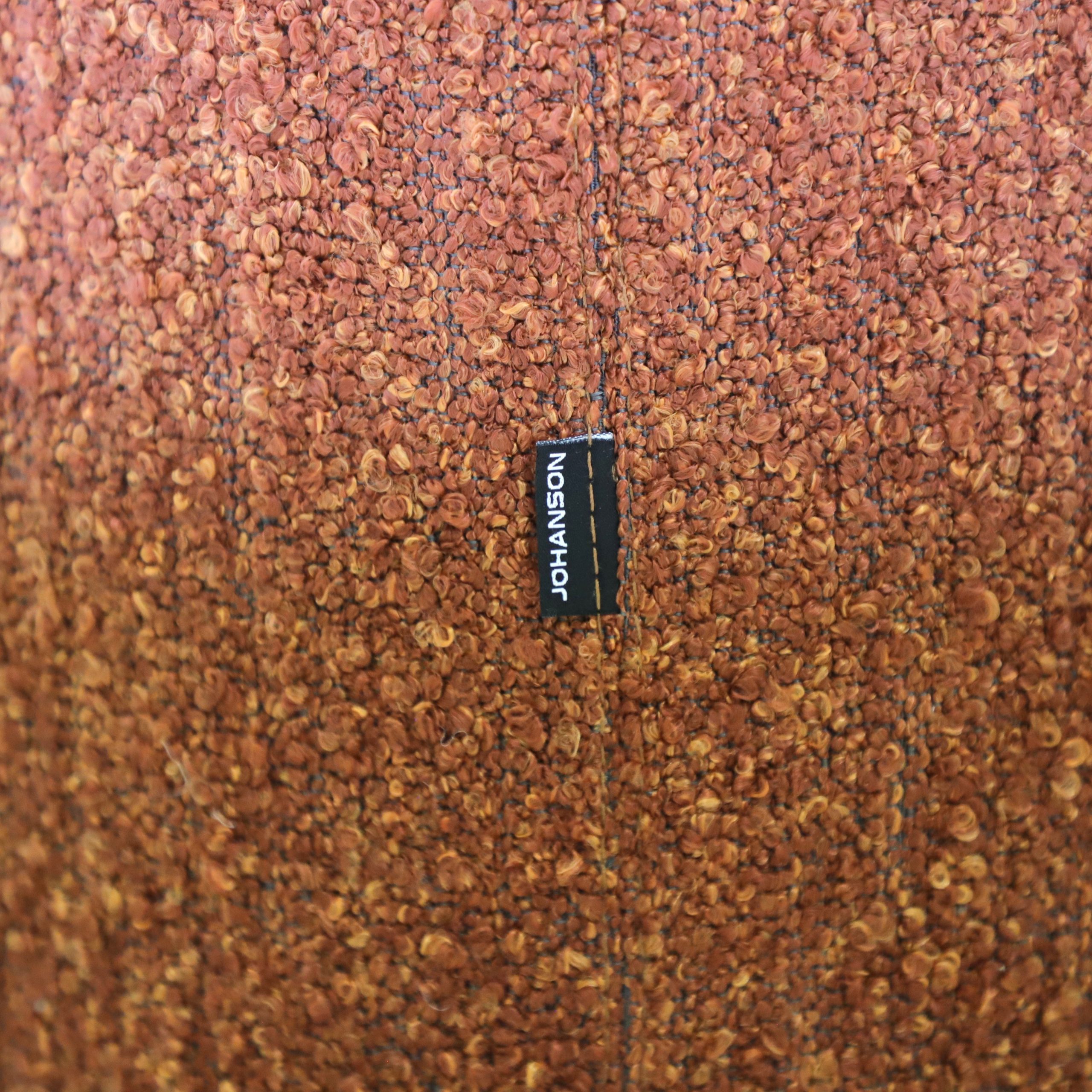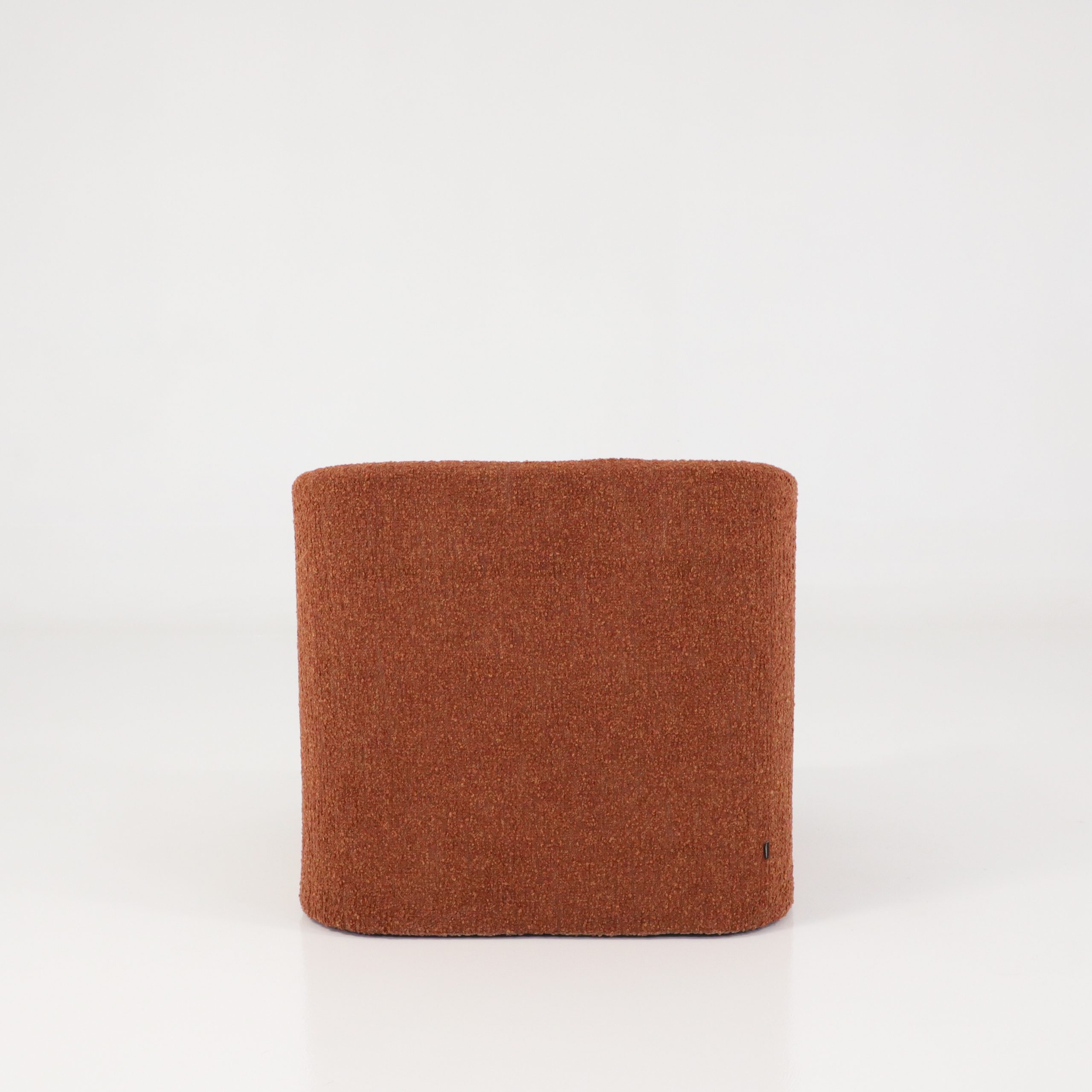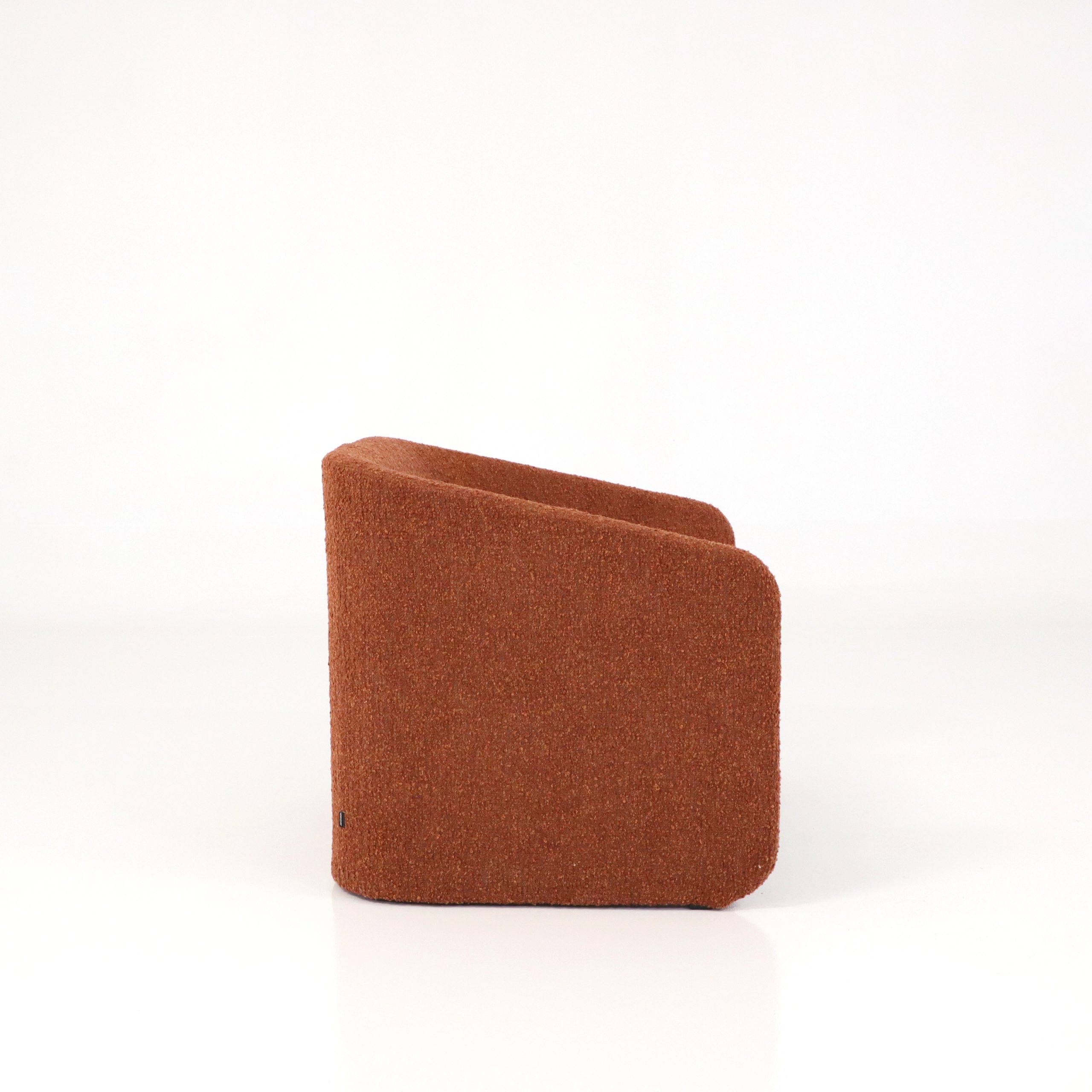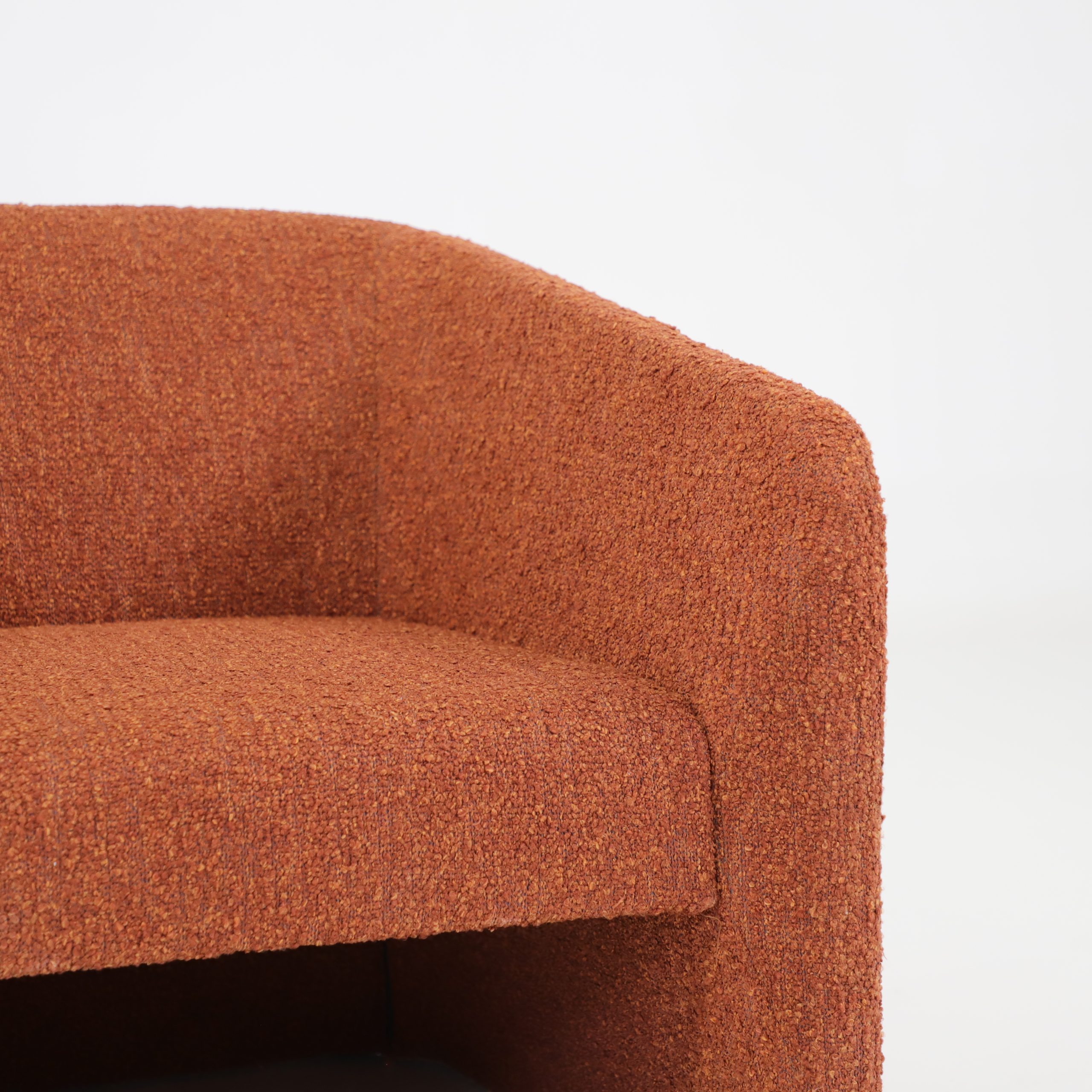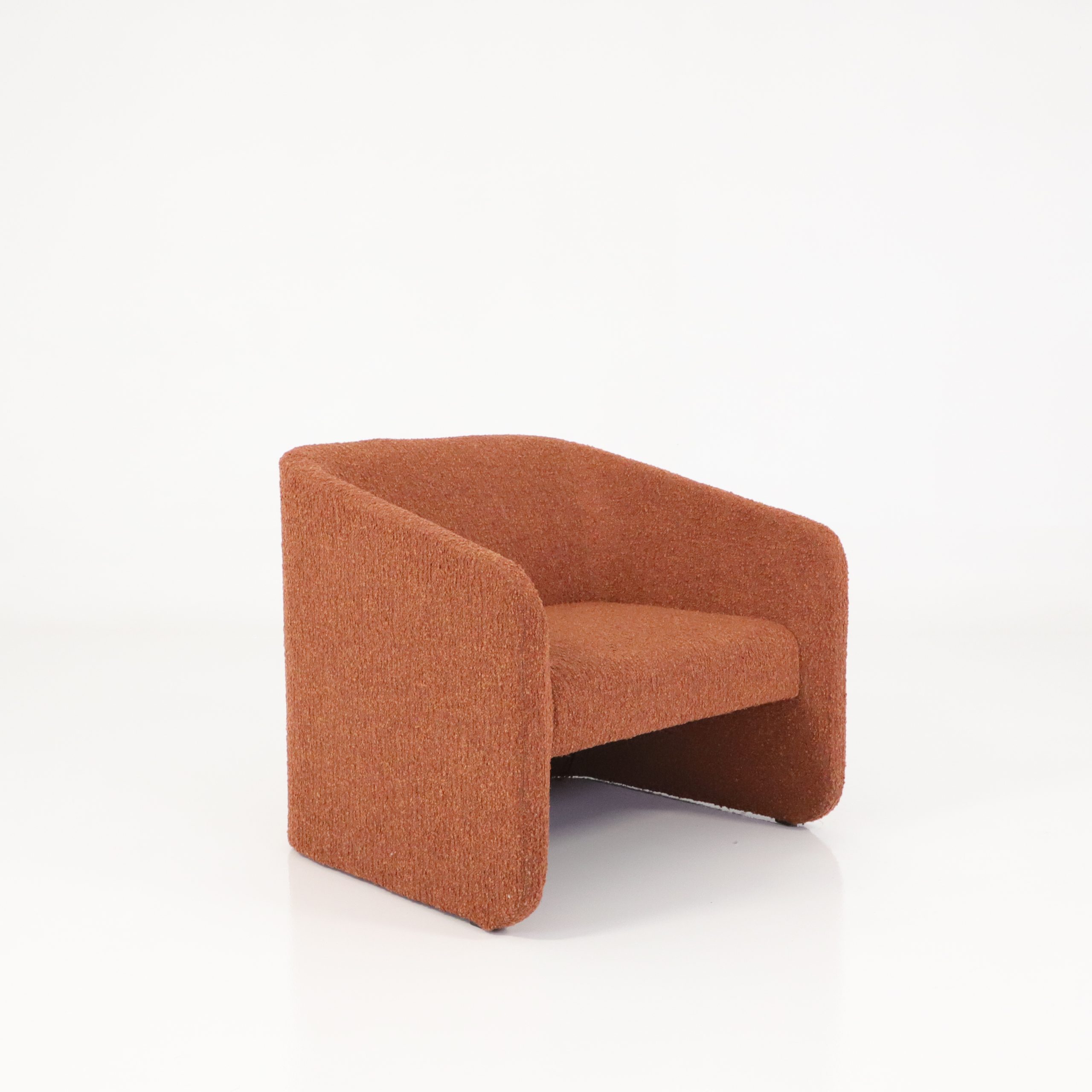 Den helklädda designen med följsamma linjer ger ett harmoniskt och tidlöst uttryck, samtidigt som den robusta konstruktionen garanterar lång hållbarhet även i offentliga miljöer. Fåtöljens roströda ton och estetiska utformning ger den pondus nog att sticka ut som en statementmöbel i ett rum för att samtidigt snyggt smälta samman med övrig inredning.