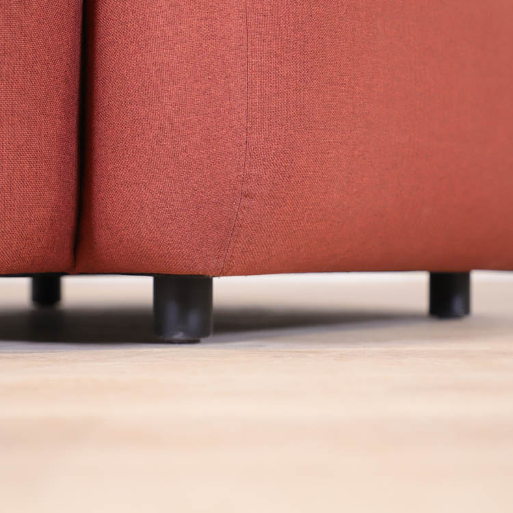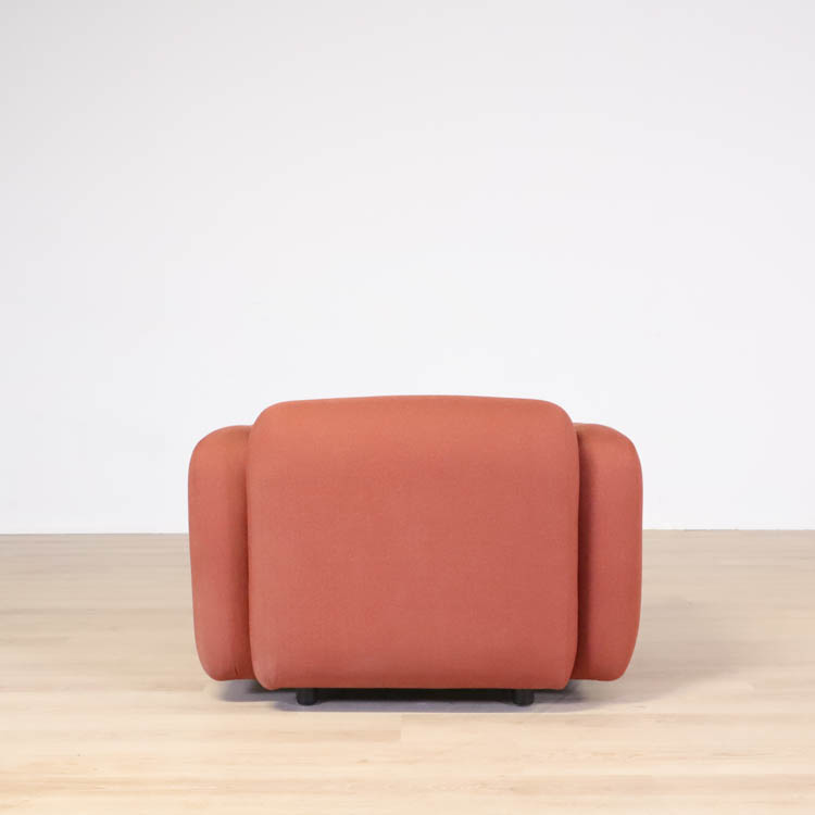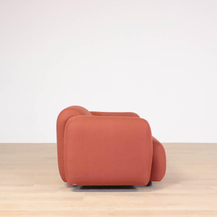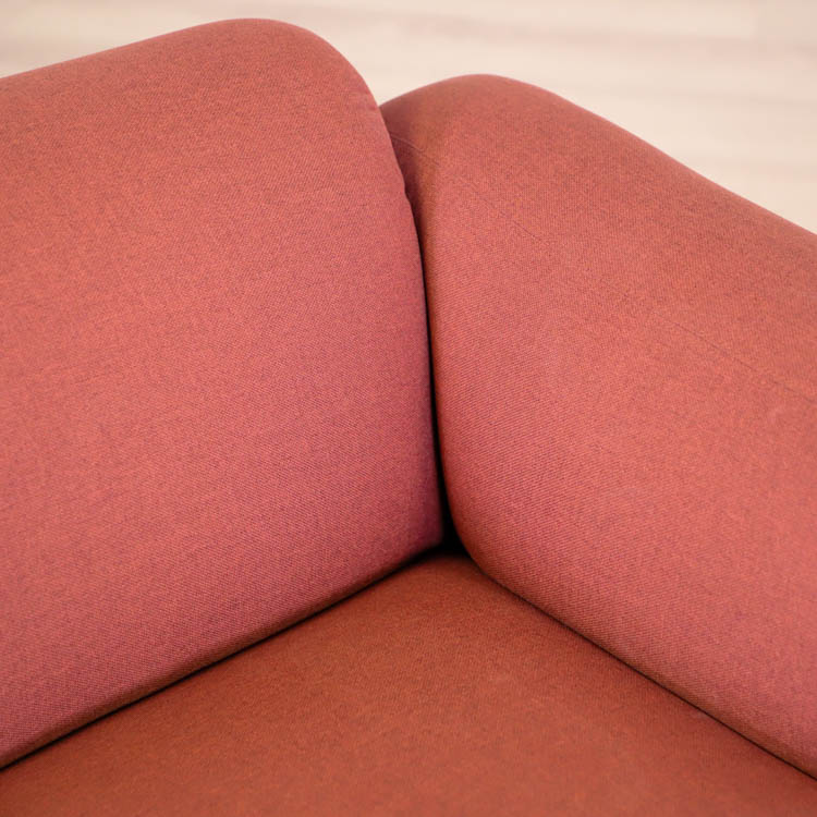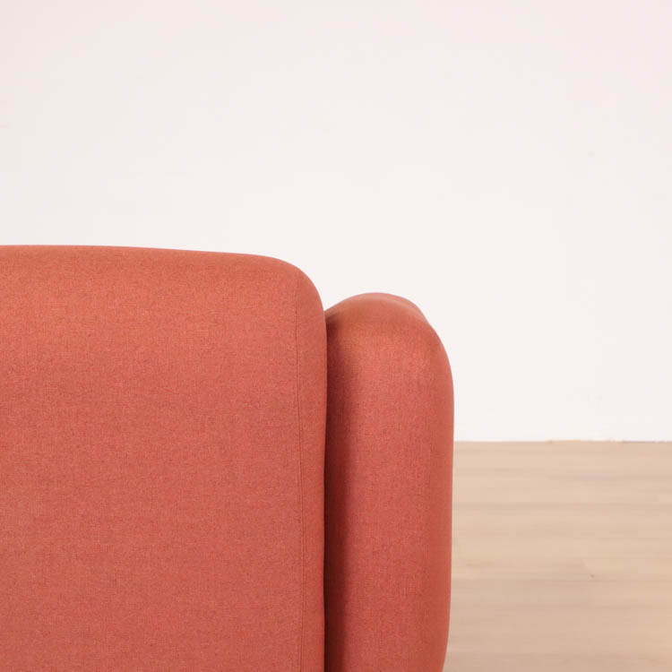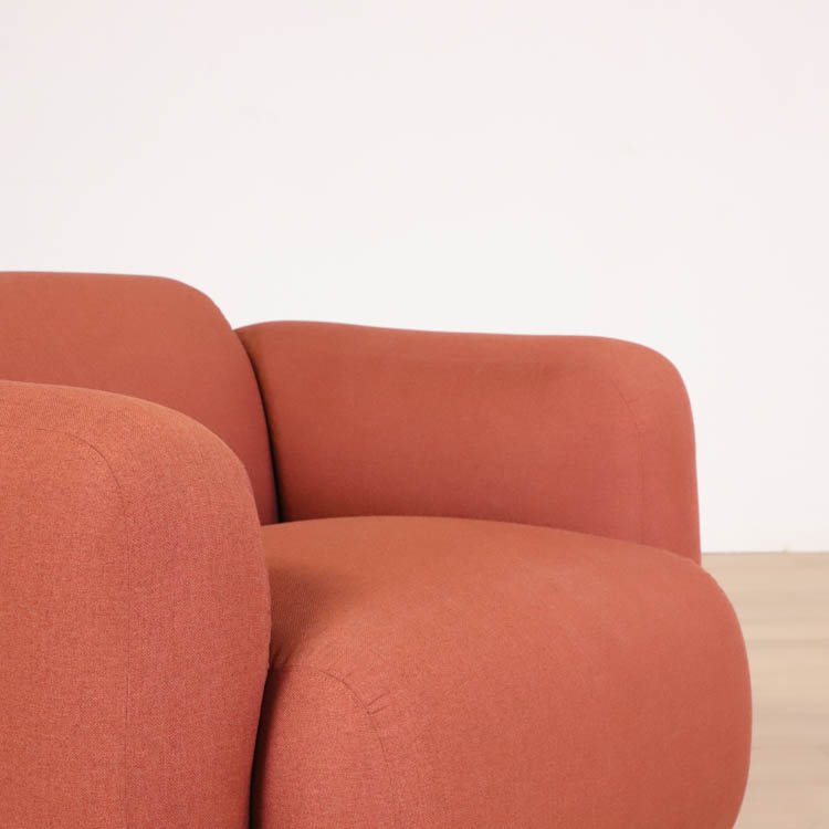 Detta utförande kommer i en rostfärgad, varm kulör och är bestående av en robust vadderad rygg och sits samt två kurviga armstöd. Sömmarna på ryggen och sitsarna delar upp sofforna i sektioner och fulländar känslan.