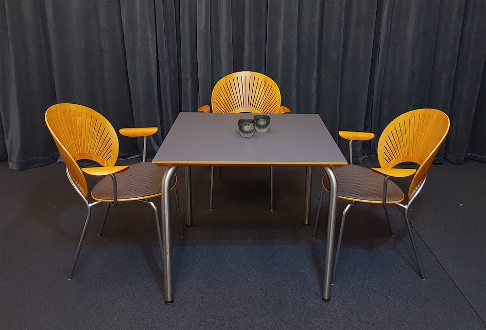 Detta snygga bord är av hög kvalité med dess högtryckta laminatskiva och mattkromade fötter. Bordet är framställt av det danska möbelföretaget Fredericia Furniture. Bordet passar lika bra i privata som i offentliga miljöer såsom till exempel fikarum, konferensrum och mötesrum.