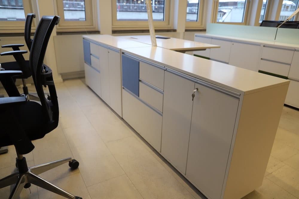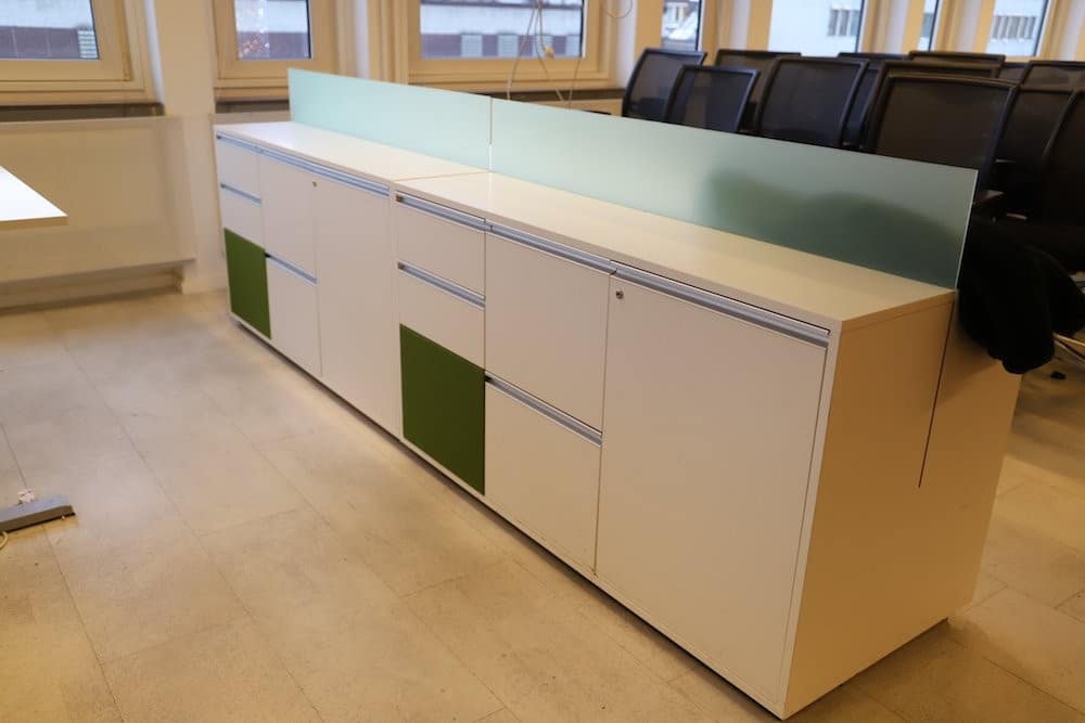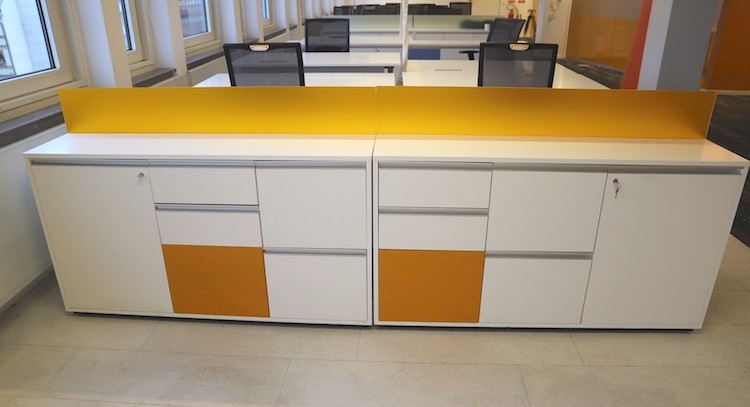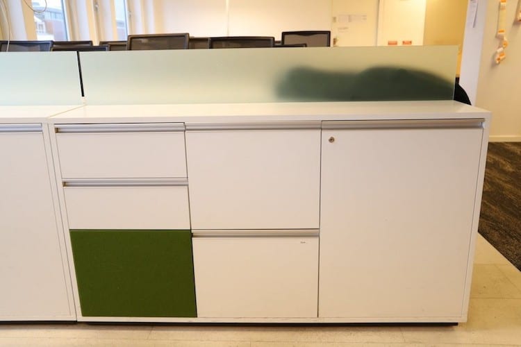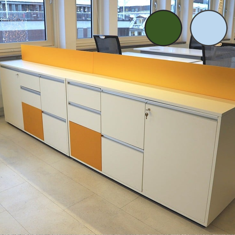 Denna specialbeställda förvaringsbänk består av 10 luckor i olika storlekar som ger möjlighet att förvara prylar i två av luckorna, och finns inne i vit/gul, vit/grön, vit/blå och vit/orange. Förvaringsbänken finns i två olika varianter. Det ena består av dubbla sidor som sitter ihop för öppna arbetsplatser och det andra är ensidig som en vanlig förvaringbänk. De ensidiga förvaringsbänkarna säljs utan skärm. Förvaringen kommer med lås, utan nyckel.