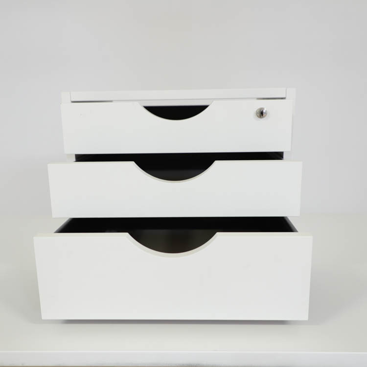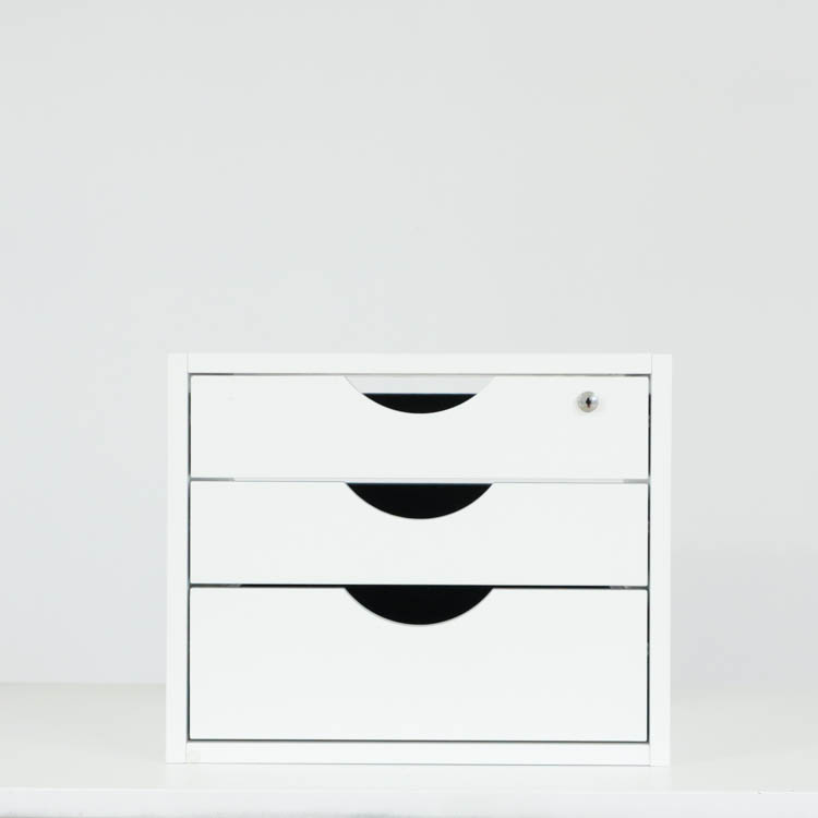 En mångsidig förvaringslåda som kan användas både på skrivbordet och som insats i skjutdörrsförvaring. Den är liten och kompakt, utrustad med tre lådor och ett praktiskt fack för pennor eller verktyg, vilket bidrar till att hålla ordning och reda. Med sin vita färg smälter lådan in perfekt i kontorsmiljön.