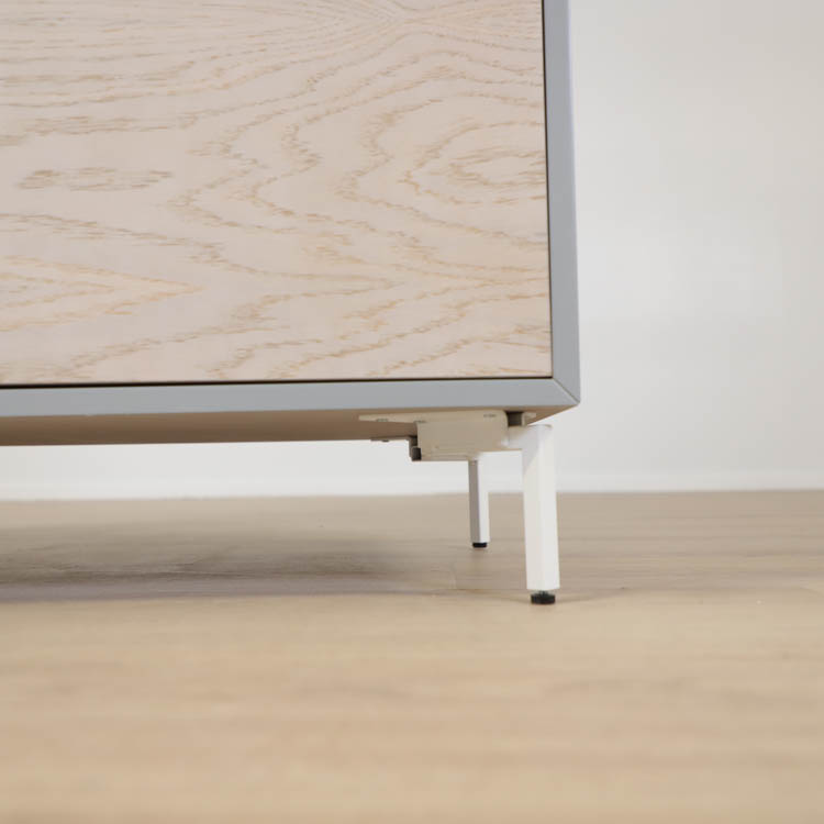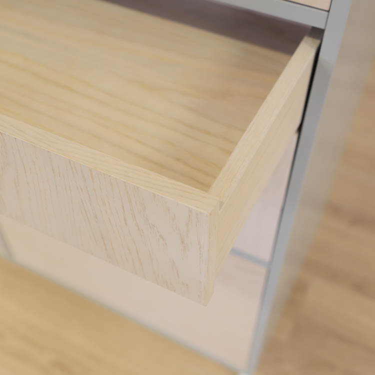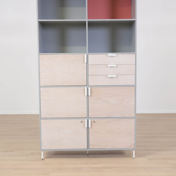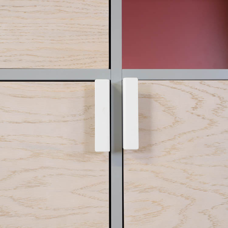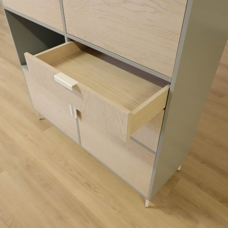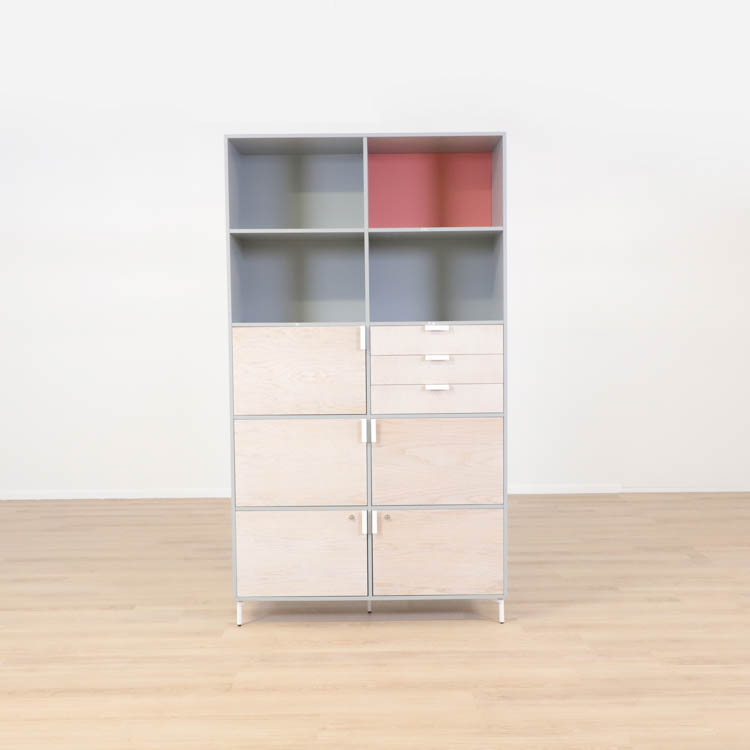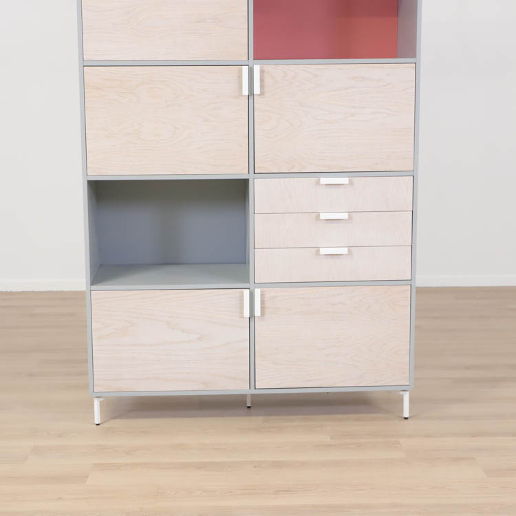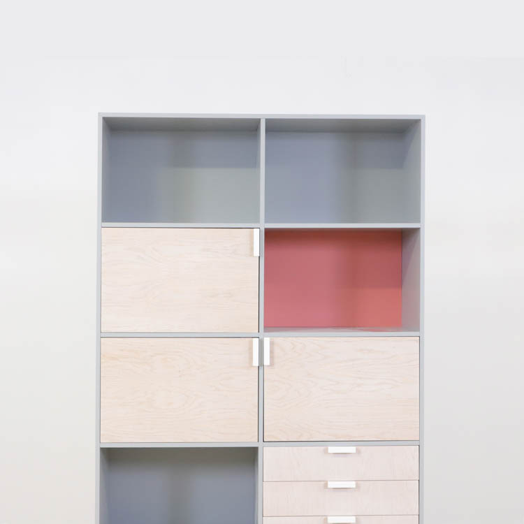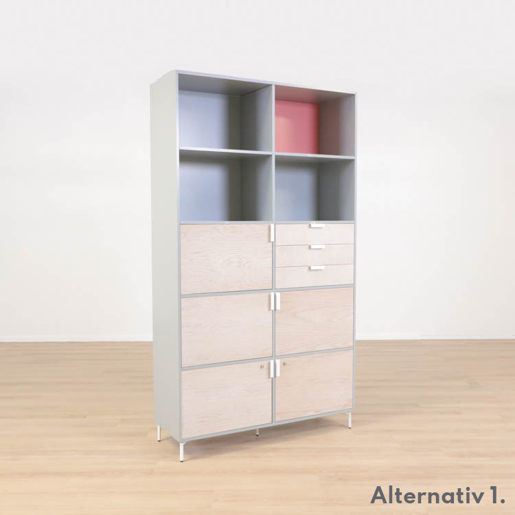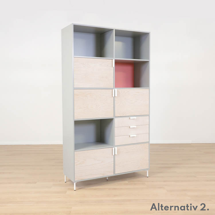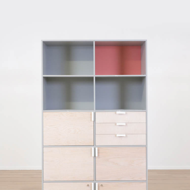 Detta utförande från Mitab kommer i en stilren grå kulör i grunden med ett rosa fack som ger en extra detalj samt förvaring i ljust trä, som vilar stadigt på vita stålben.