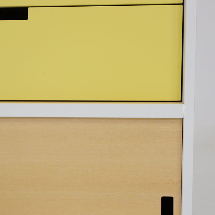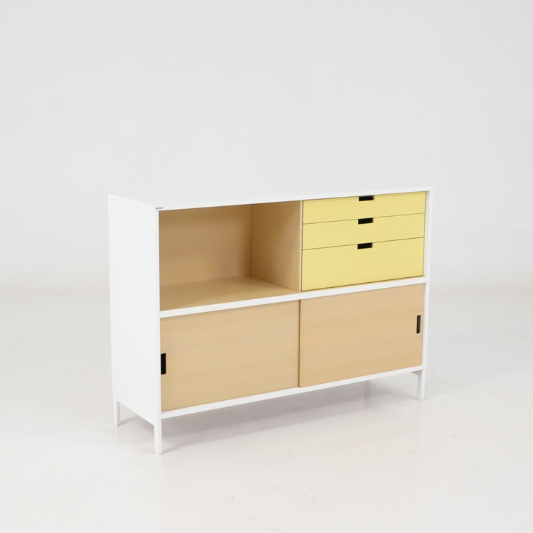 Praktiskt skåp från Edsbyn med lådor och skjutdörrar i mjuk gul ton eller härlih blå nyans. En välbalanserad kombination av öppen förvaring, praktiska lådor och dold förvaring bakom skjutdörrar som är gjord för att kunna stå mitt i rummet då den är lika fin från alla sidor. Stabil konstruktion med tidstypisk design som passar lika bra i kontor som i kreativa miljöer. Ett funktionellt och karaktärsfullt förvaringsskåp med tydlig skandinavisk känsla.