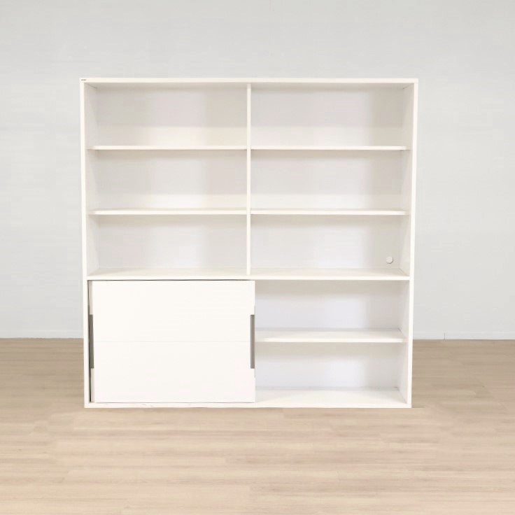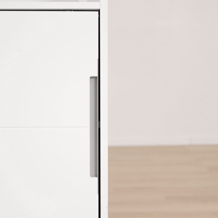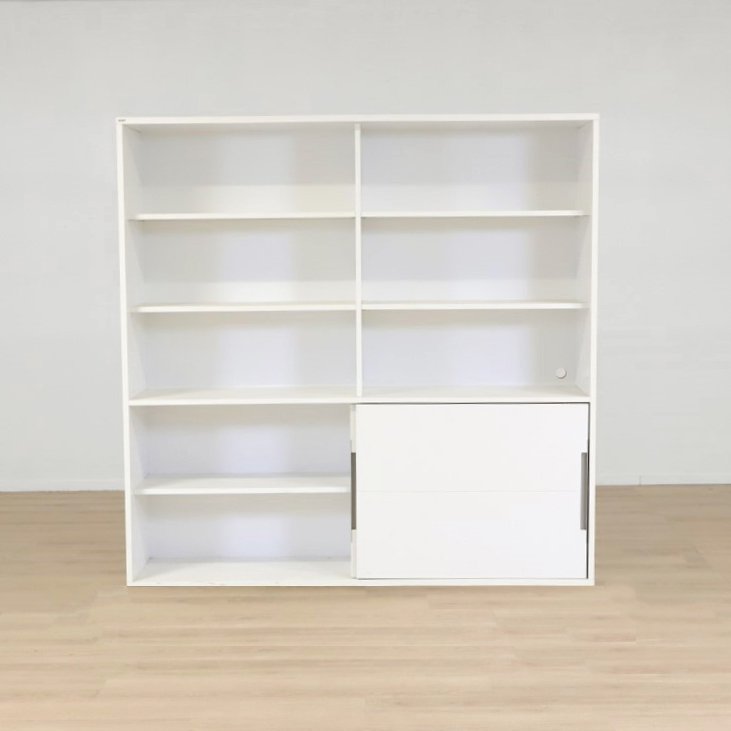 Förvaringsskåp från Edsbyn i helvitt utförande och praktiska skjutdörrar med diskreta handtag nedtill på den stängda förvaringen. Utöver detta rymmer skåpet två rymliga hyllplan/tre fack.