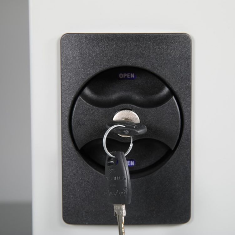 Med två inkluderade hyllplan som är justerbara i höjd kan du enkelt anpassa förvaringen efter behov, oavsett om det gäller pärmar eller kontorsmaterial. Det integrerade spanjolettlåset med tre låspunkter ger en trygg och säker förvaring av viktiga dokument och värdesaker.