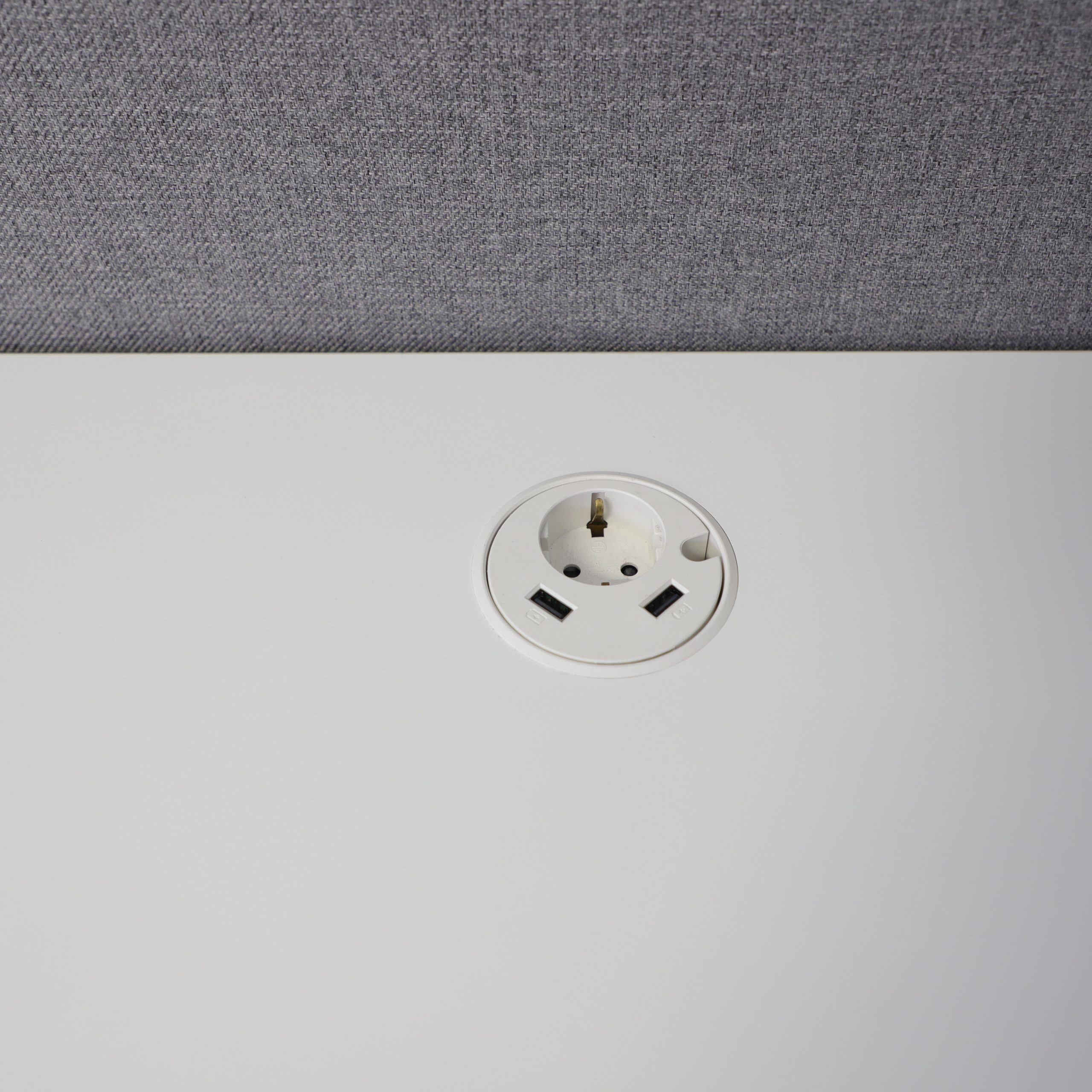 Arbetsställningen justeras enkelt med ett knapptryck med hjälp av det elektriskt höj- och sänkbara stativet ifrån Inergo. Bordsskivan har en kabellucka samt ett integrerat eluttag med ytterligare två uttag för USB för att optimera och förenkla arbetet. Den integrerade skrivbordsförvaringen håller arbetsytan fri ifrån arbetsdokument och kontorsmateriel och samtidigt frigör yta på golvet, vilket underlättar rengöring runt arbetsplatsen. Stativ för papperskorg medföljer, papperskorg ingår ej.