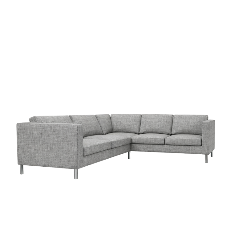 Hörnsoffa med 2 platser på den korta sidan och 3 platser på den lägre sidan. Klädd i slitstarkt grått tyg och metallben. En prisvärd soffa med enkel design som passar de flesta hem eller kontor.