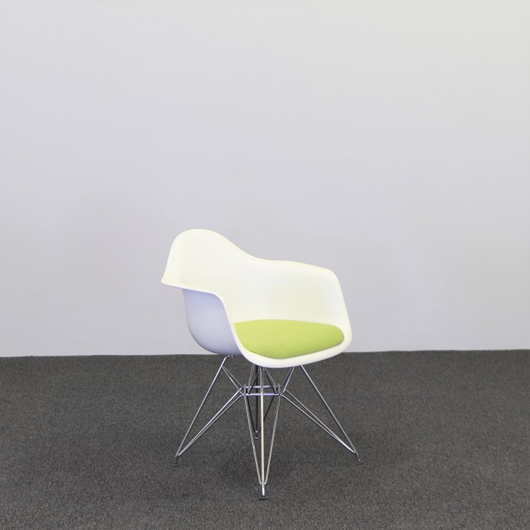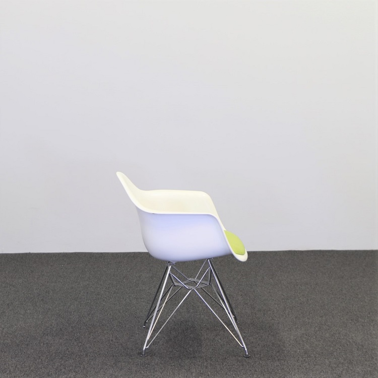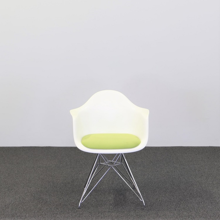 Den formgjutna sitsen tog år att utveckla och är anpassad för att ge optimal bekvämlighet. Ryggens form kommer i vitt utförande ger bra stöd och har en lätt svikt som tillsammans med armstöden omfamnar dig och därmed optimerar komforten i denna designstol. Dynan till sitsen i ett ljust grönt tyg medföljer och ger ett kulört inslag till stolen som med rundningen i framkant på sitsen som minskar tryckbelastning under låren. En perfekt stol för besöksrummet, loungeutrymmet eller mötesrummet.