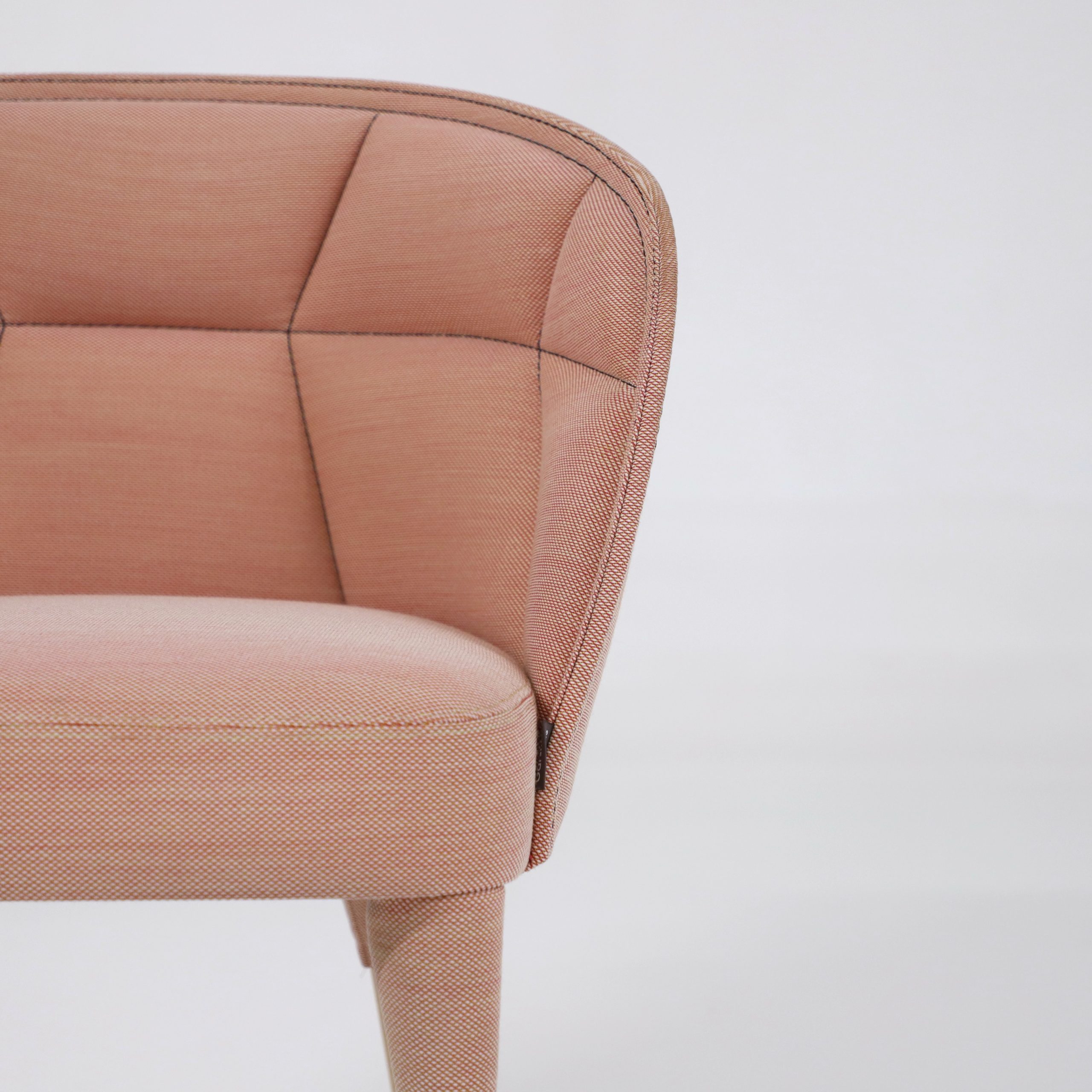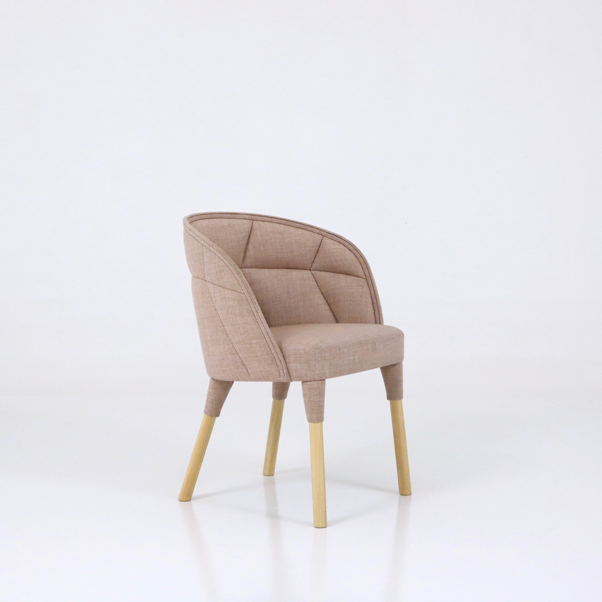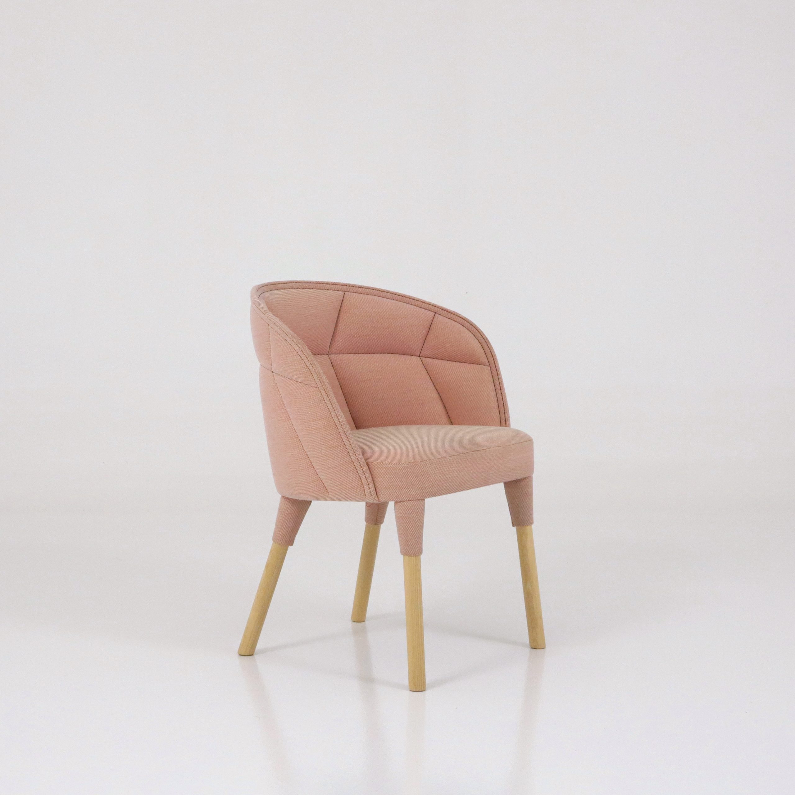 Emily är en elegant karmstol från Gärsnäs som kombinerar skandinavisk formkänsla med hög komfort. Stolen har en tygklädd rygg och sits, den klädda ryggen har genomgående stickningar som ger en exklusiv detalj och finns i tre kulörer för att enkelt matcha övrig inredning. Välj mellan dov gammelrosa, rosa eller djupblå. Stolen står på ett stabilt trästativ med fyra ben i massivt trä, utrustat med plasttassar för skonsam användning på olika golv.