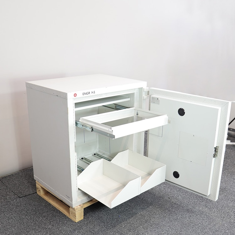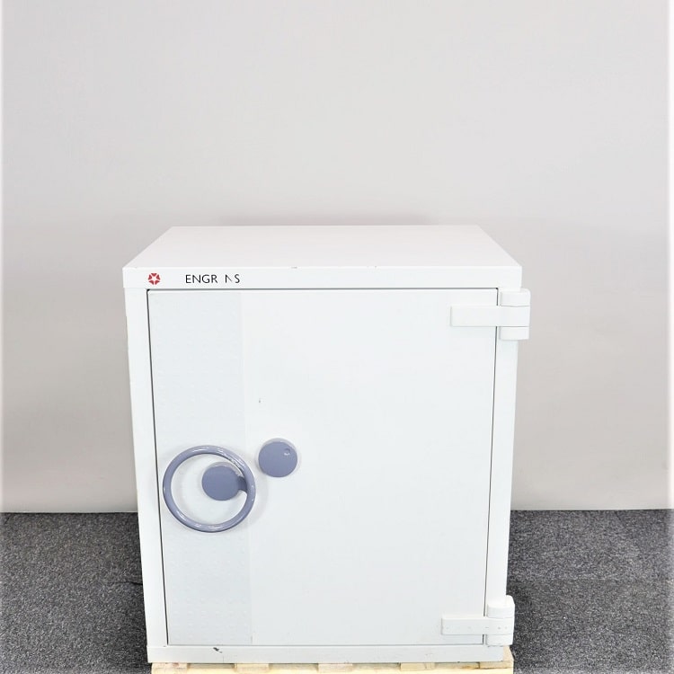 Ett säkerhetsskåp som erbjuder både en säker och praktiskt lösning för dina viktiga handlingar och dokument. Rosengren är en välkänd och etablerat företag inom tillverkning av kassaskåp. Den här modellen låses med nyckel och den är brandsäker och genom sin tyngd skyddar den även mot tjuvar. Inuti har du praktisk förvaring i form av två skjutbara lådor utformade för pärmar samt ett skjutbart hyllplan ovan med genomskinlig skiva så att du lätt har överblick över säkerhetsskåpets innehåll. Utvändigt normalt bruksslitage.