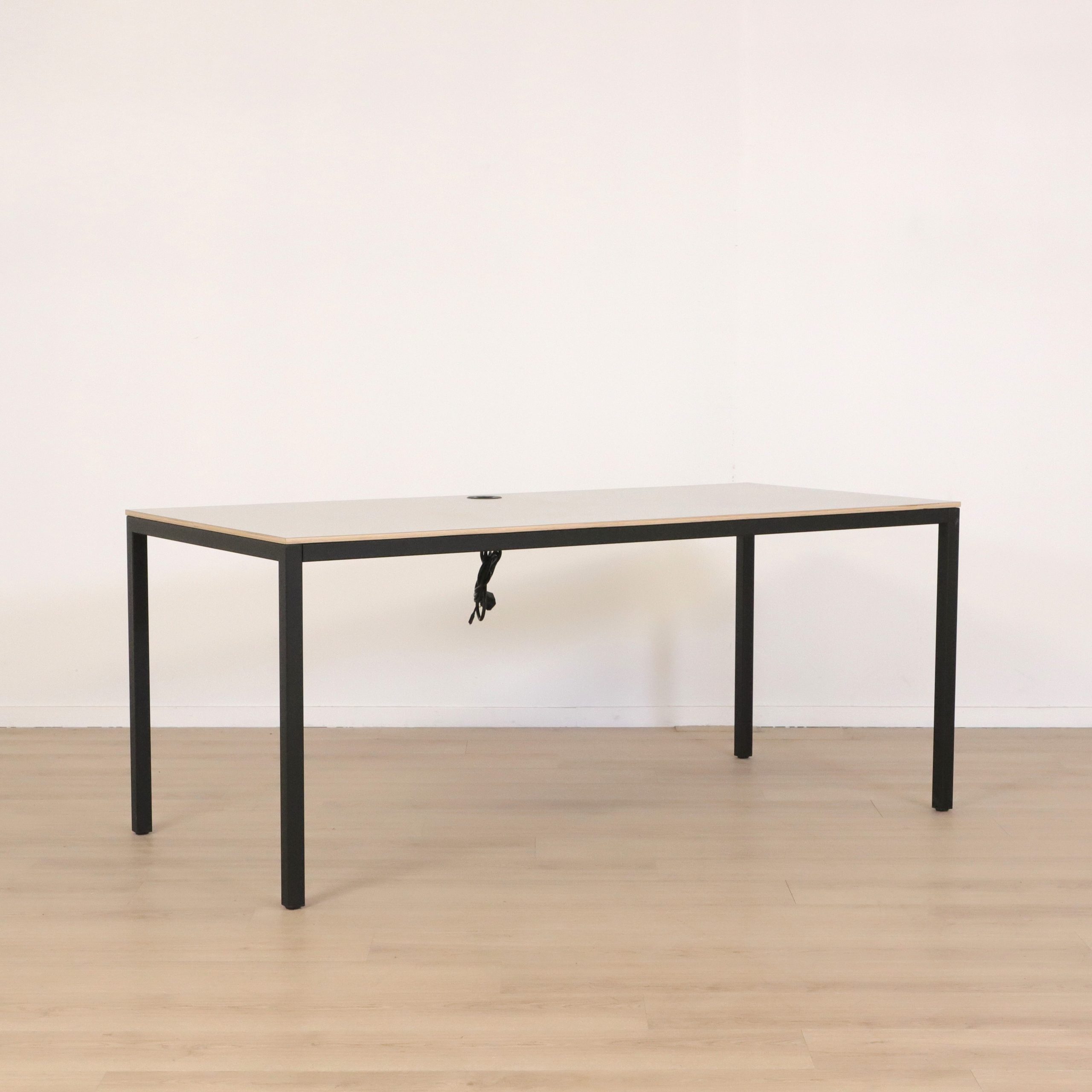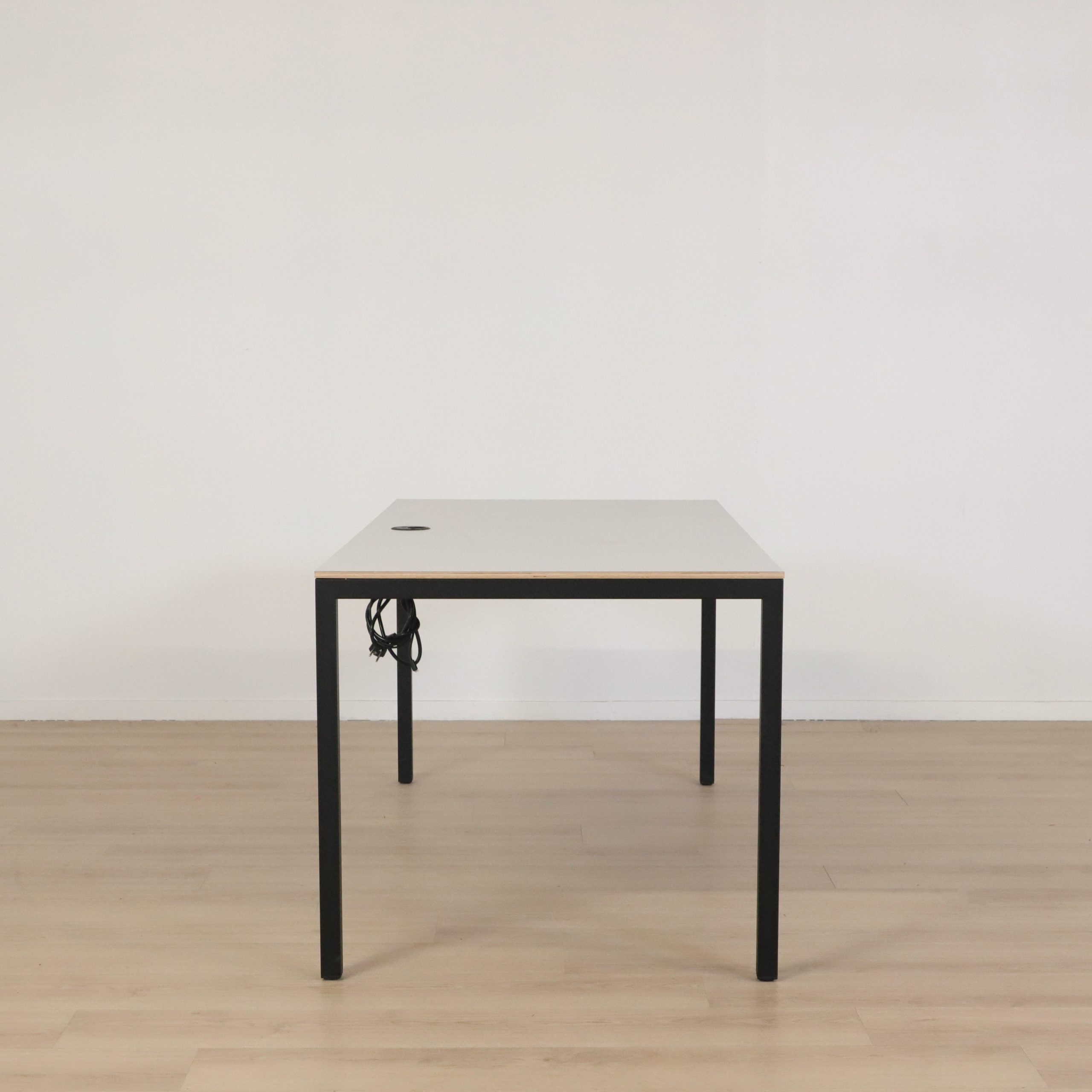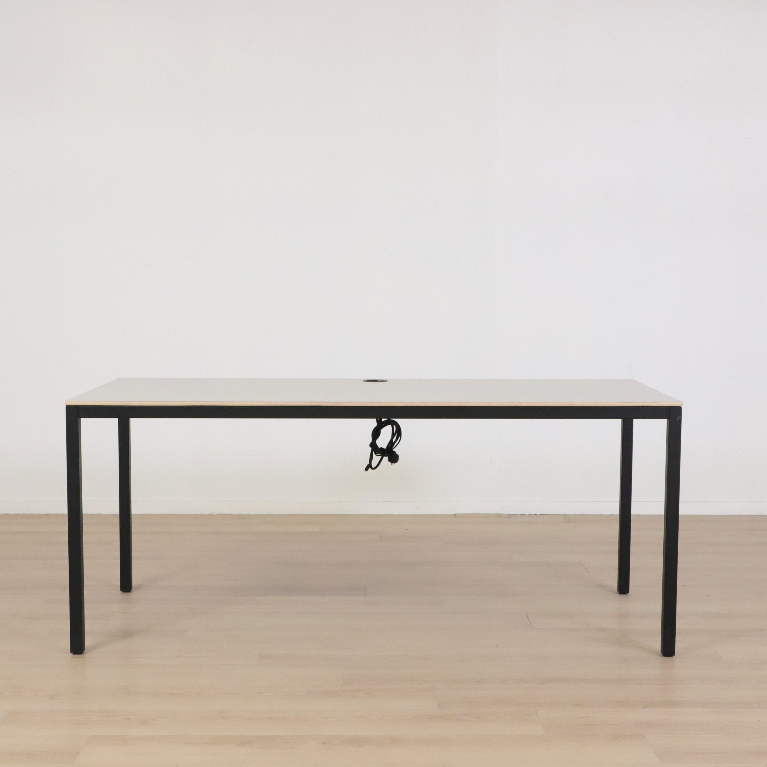 Det här stilrena konferensbordet Artur från SA Möbler är ett utmärkt val för moderna kontorsmiljöer där både funktion och form är viktiga. Med sin tunna bordsskiva i ljusgrå laminat med kantlist i trä som ger en tydligt markerad kant mot den svarta, slanka stålstommen får bordet ett minimalistiskt uttryck som smälter in i alla typer av arbetsytor. Det inbyggda eluttaget i bordsskivan gör det enkelt att hålla ordning på sladdar och teknik – ett måste i dagens digitala arbetsmiljö.