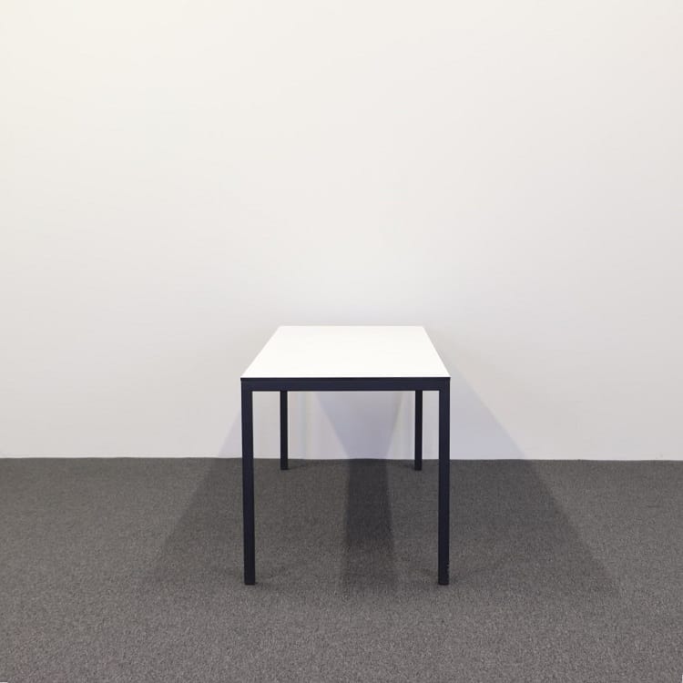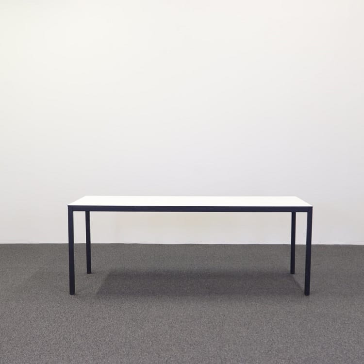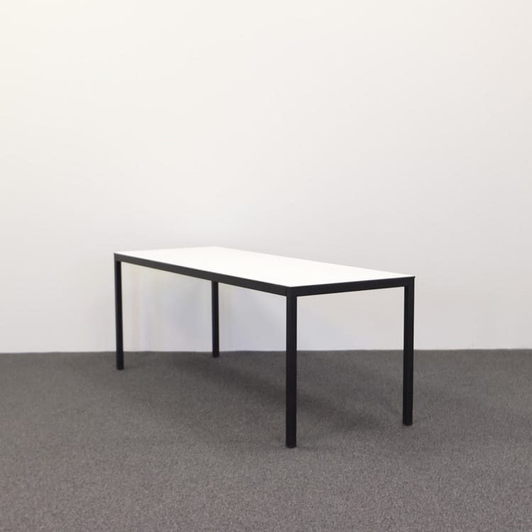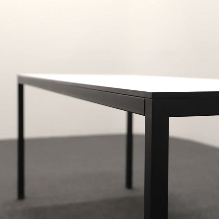 Ett stilfullt konferensbord, designat med noggrant övervägda detaljer, utgör en modern och funktionell arbetsyta. Bordet har ett robust pulverlackerat stativ i djupt svart, vilket ger en elegant kontrast till den rena och ljusa estetiken hos den vita skivan. Skivan i vitt kompaktlaminat med en svart kärna ger inte bara en snygg visuell kontrast utan erbjuder också hållbarhet och motståndskraft mot daglig användning.