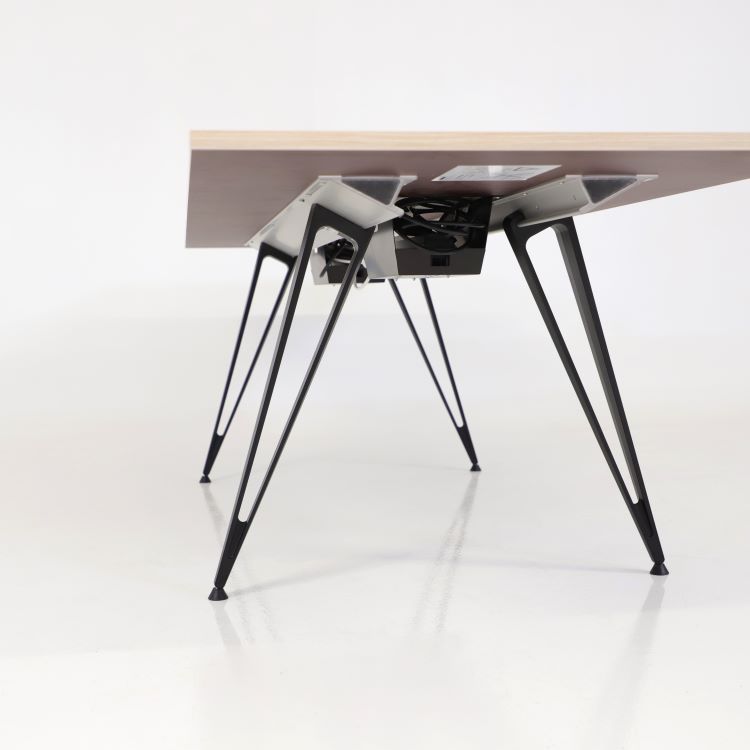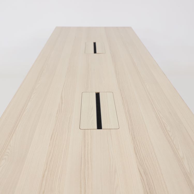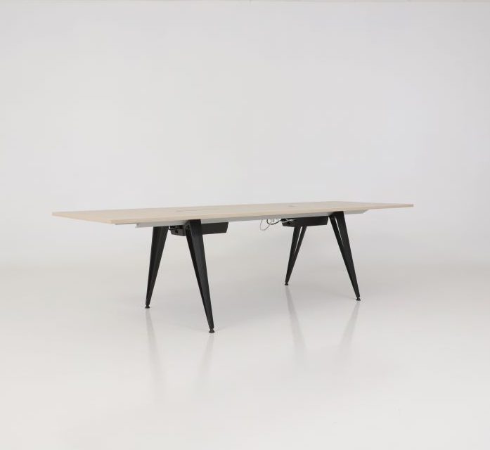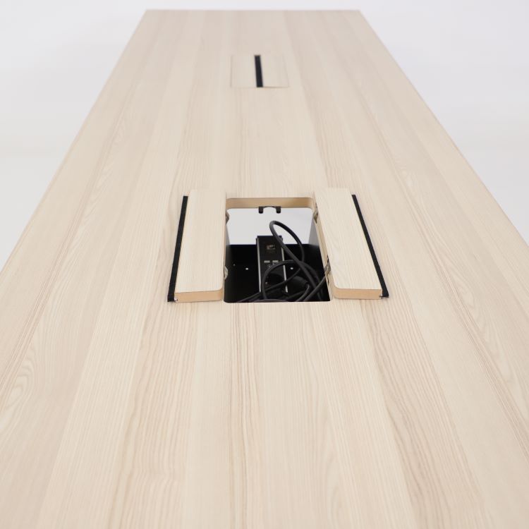 Bordsskivan kommer med integrerad kabelhantering som gör det enkelt att organisera strömkablar, nätverk och elektronik – perfekt för moderna möten med datorer och videokonferensutrustning.