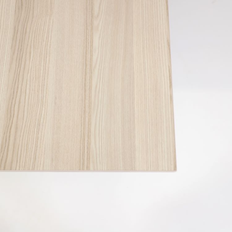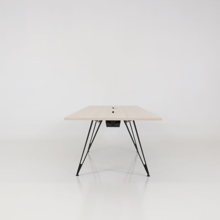 Detta bord kännetecknas av en tunn, elegant bordsskiva i träfanér som kombineras med smala, vinklade metallben i svart, vilket ger ett lätt men stabilt uttryck. Den öppna konstruktionen under bordsskivan skapar en luftig känsla och underlättar både rörelsefrihet och rumsplanering.