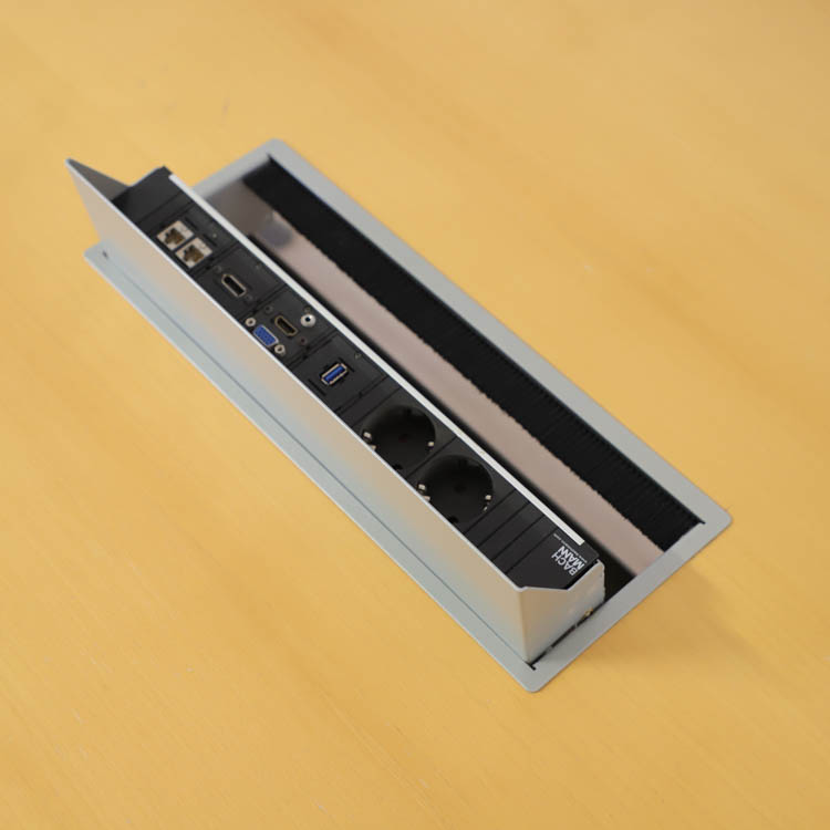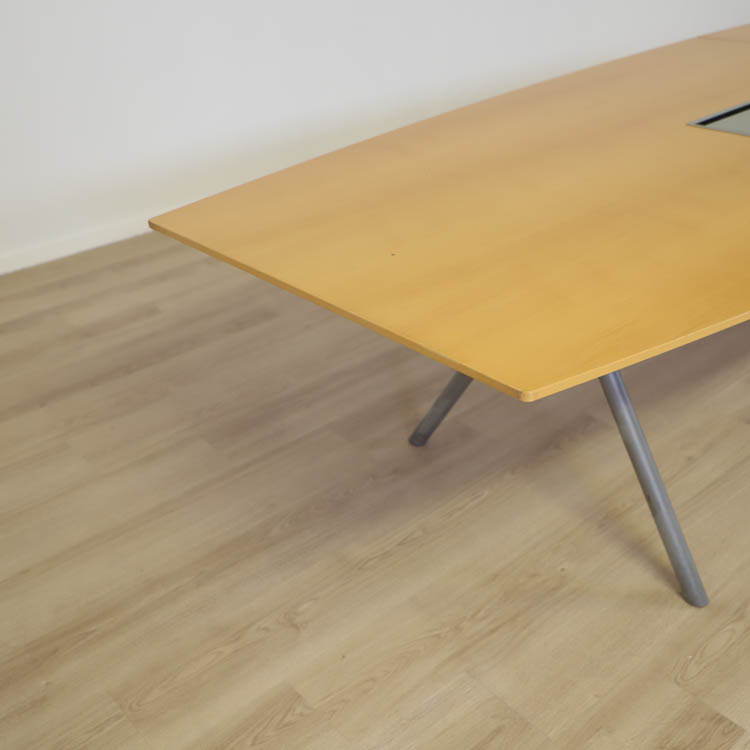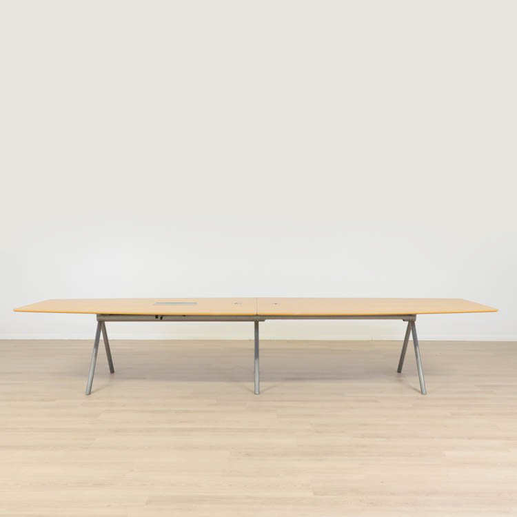 Avia konferensbord från EFG är ett båtformat bord som tack vare dess storlek rymmer många deltagare samtidigt. Bordet har en tvådelad träskiva med V-stativ som ger en unik design som väcker intresse. Bordet erbjuder kabelbox och hål för kabeldragning och är utrustat med integrerat kabeldike gömt inuti balken vilket ger intrycket av ordning & reda.