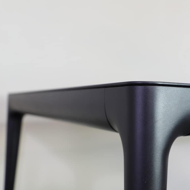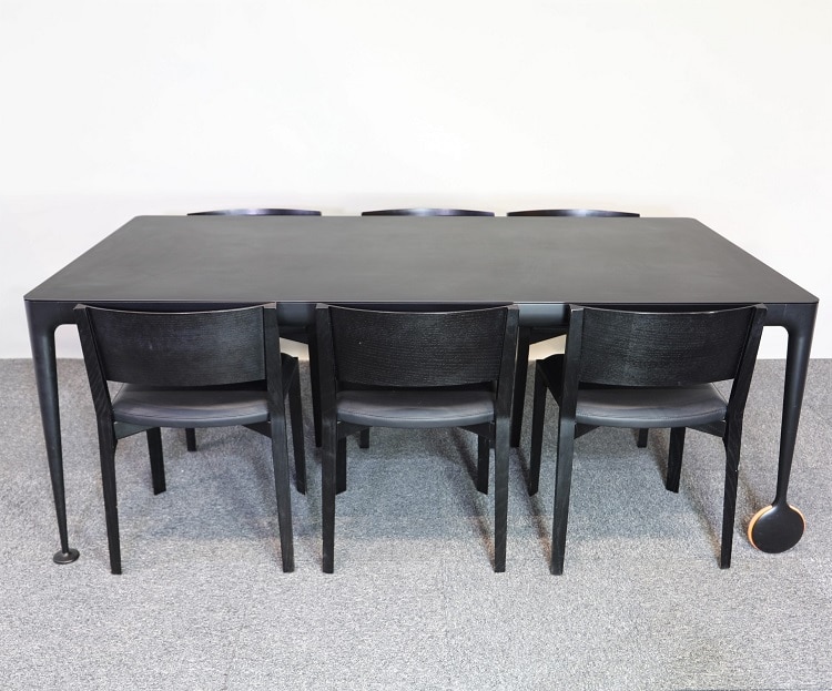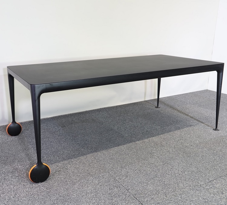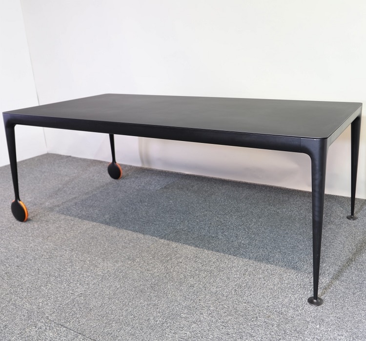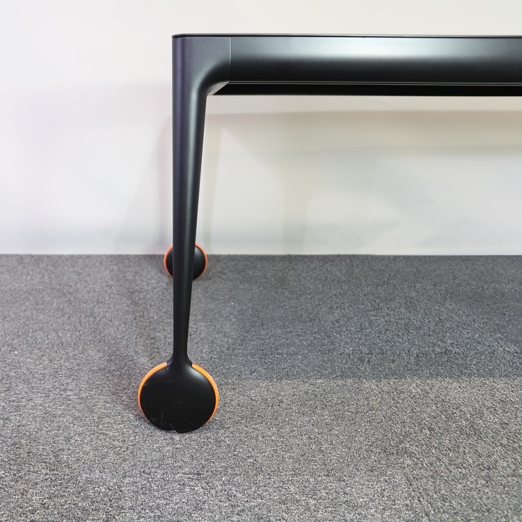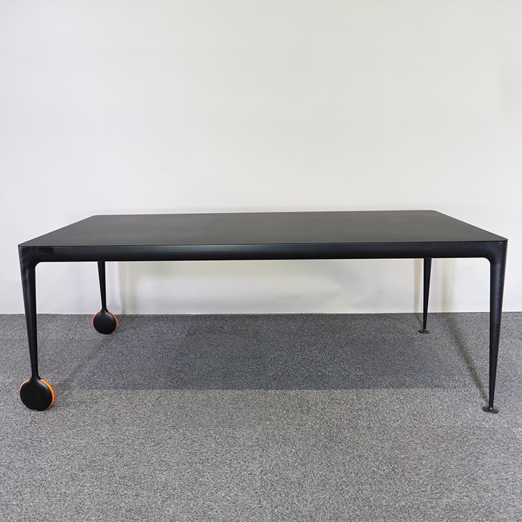 Svart stilrent konferensbord Big Will designat av Philippe Starck för italienska Magis. Detta rektangulära bord passar utmärkt både som middagsbord och konferensbord. Ben av gjutet aluminium samt den extra detaljen med orangea hjul ger hela bordet ett lyft. Hjulet uppfyller inte bara en estetisk funktion utan underlättar när man enkelt vill flytta bordet för att frigöra utrymme. Med hjulens hjälp kan man på egen hand rulla bort bordet vid behov.