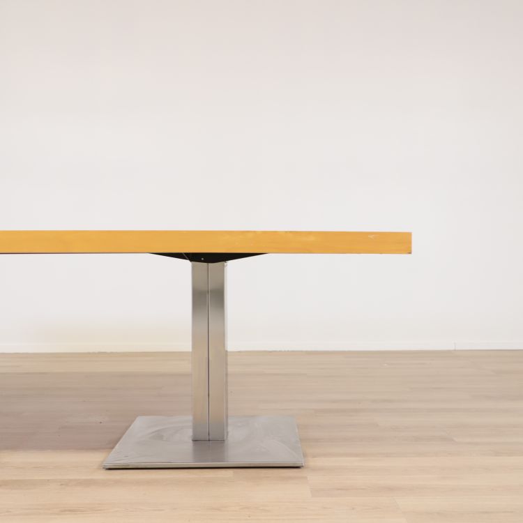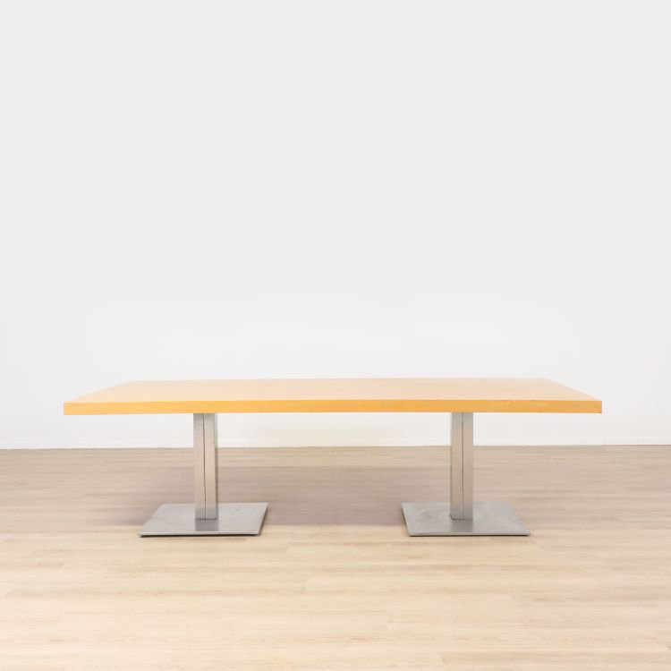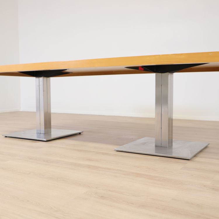 Konferensbord med en yta i bokträ, vilket ger det ett klassiskt och stilrent utseende. Bordet är i bra skick, trots att det har vissa kantstötningar och små repor som är typiska för en använd produkt. Det har robusta ben som ger stabilitet. Den stabila bordsskivan, trots sina mindre skavanker, gör det fortfarande till ett populärt val i både kontors- och utbildningsmiljöer. Bordet passar bäst i rum med neutrala färgpaletter som grått, vitt eller ljusa trätoner, vilket framhäver bordets moderna design.