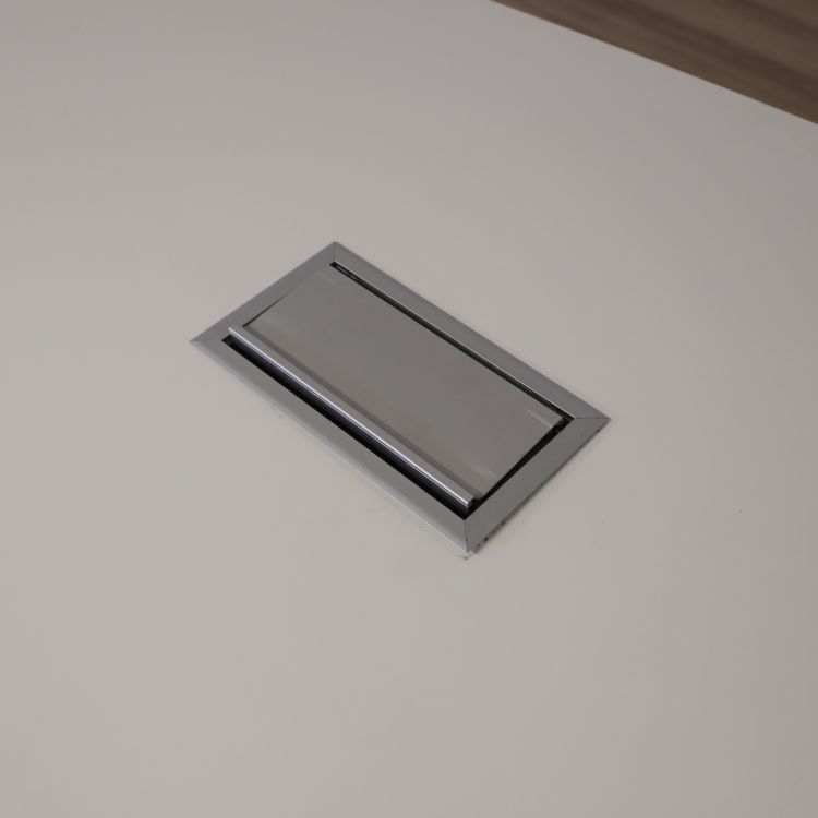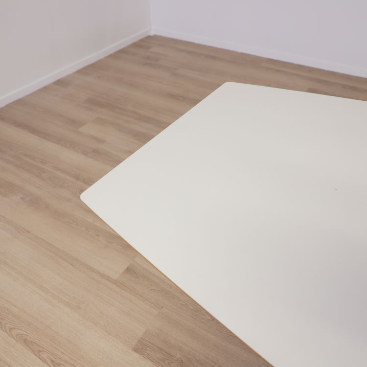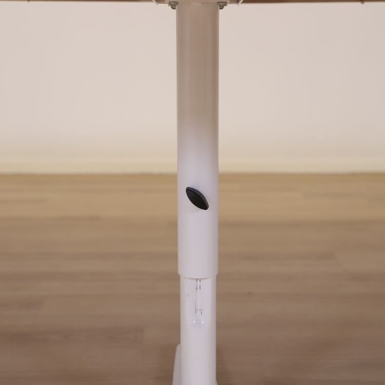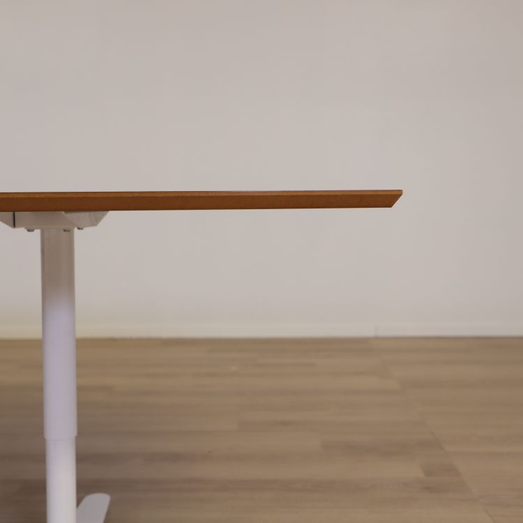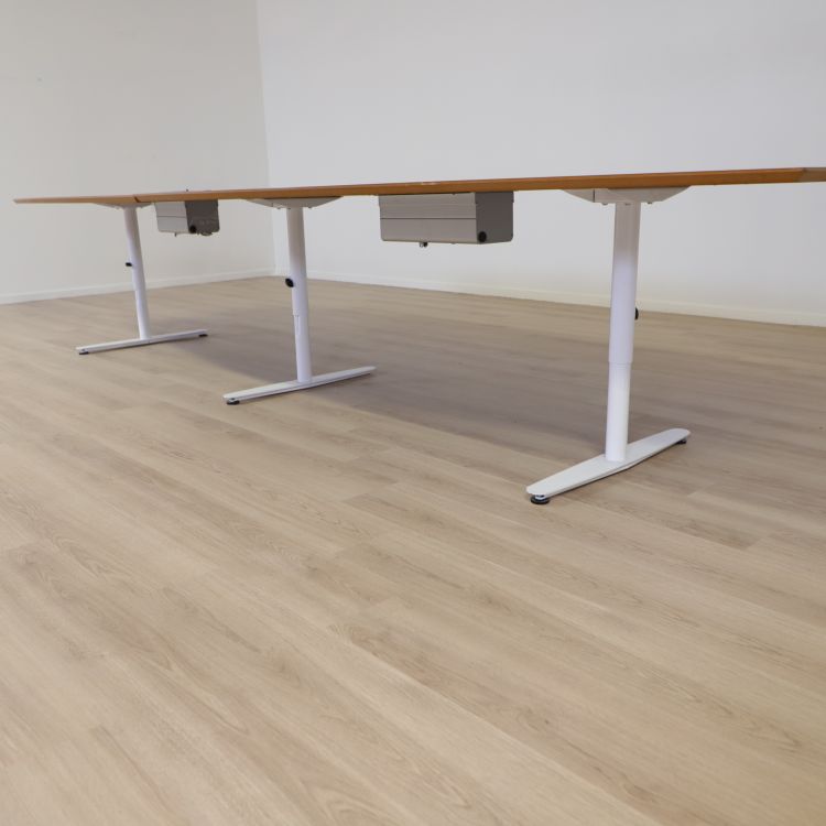 Bordet består av två separata delar som tillsammans bildar en enhetlig yta, och det står stadigt på tre T-ben som ger utmärkt stöd. Höjden är justerbar med hjälp av en synlig skruv på benen, vilket gör att bordet kan anpassas efter olika behov. För att underlätta kabelhantering och hålla ytan fri från sladdar, är bordet utrustat med två PowerDox-enheter som smidigt leder elkablar till sina uttag.