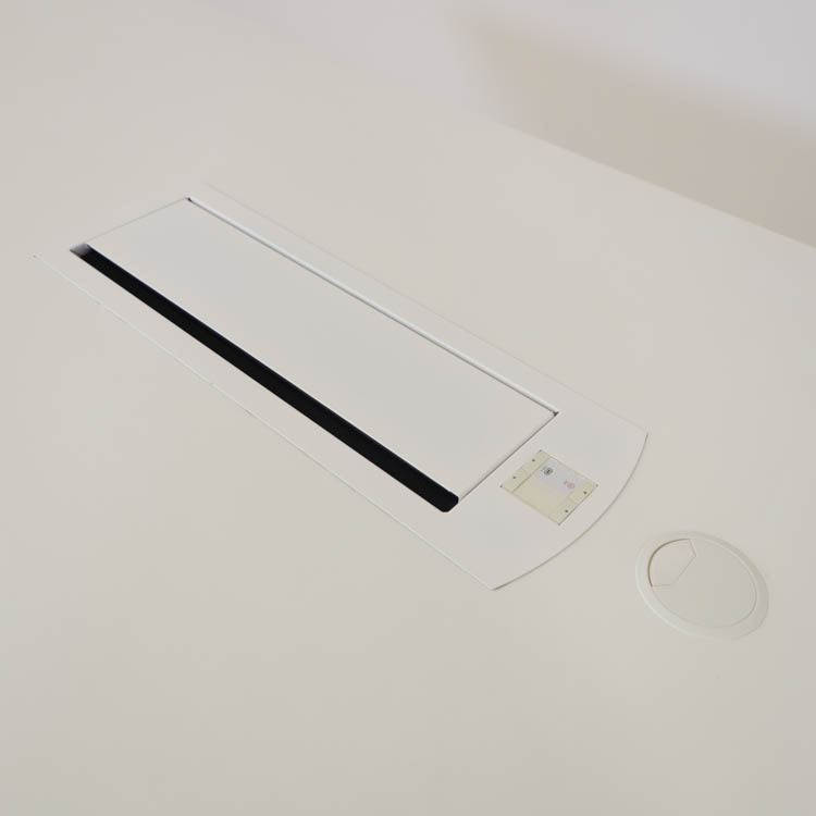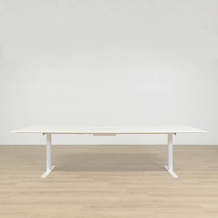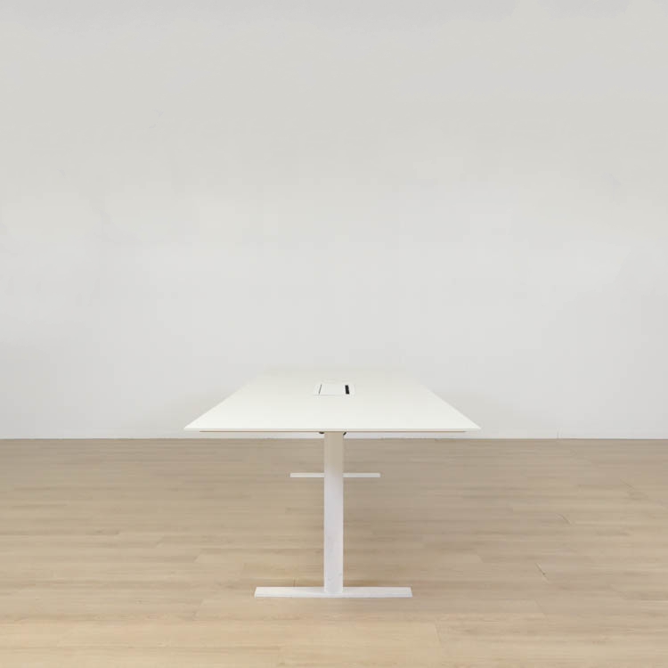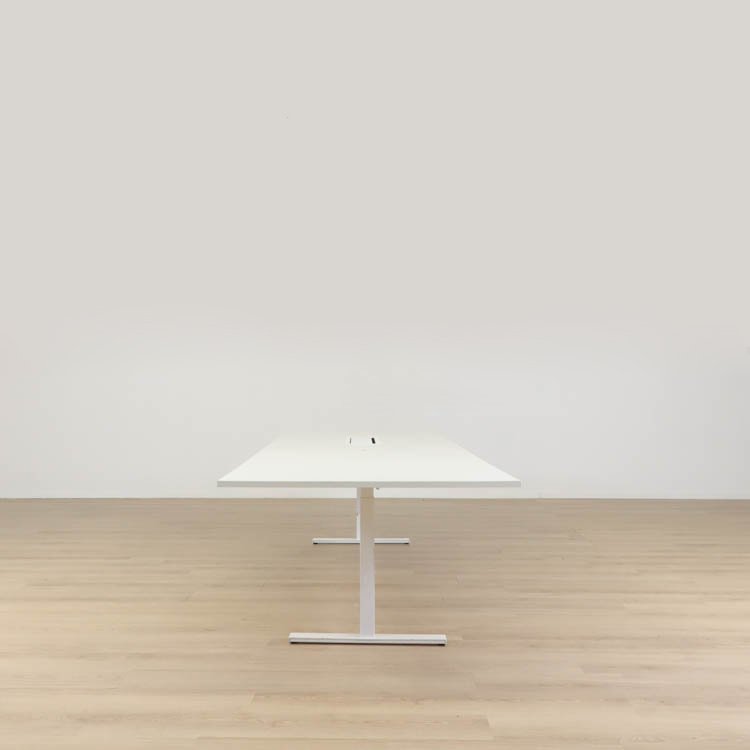 Detta konferensbord från EKV är passande för moderna mötesrum och arbetsmiljöer. Med en vit bordsskiva ger den ett elegant och professionellt intryck och en generös arbetsyta som passar perfekt för både mindre och större sammankomster. Den slitstarka ytan säkerställer lång hållbarhet och enkel rengöring, medan det stabila underredet med vita T-formade ben ger en modern och minimalistisk look. För att underlätta kabelhantering och skapa en prydlig arbetsmiljö är bordet utrustat med en integrerad powerbox i mitten, vissa av borden har även ett litet kabelhål.