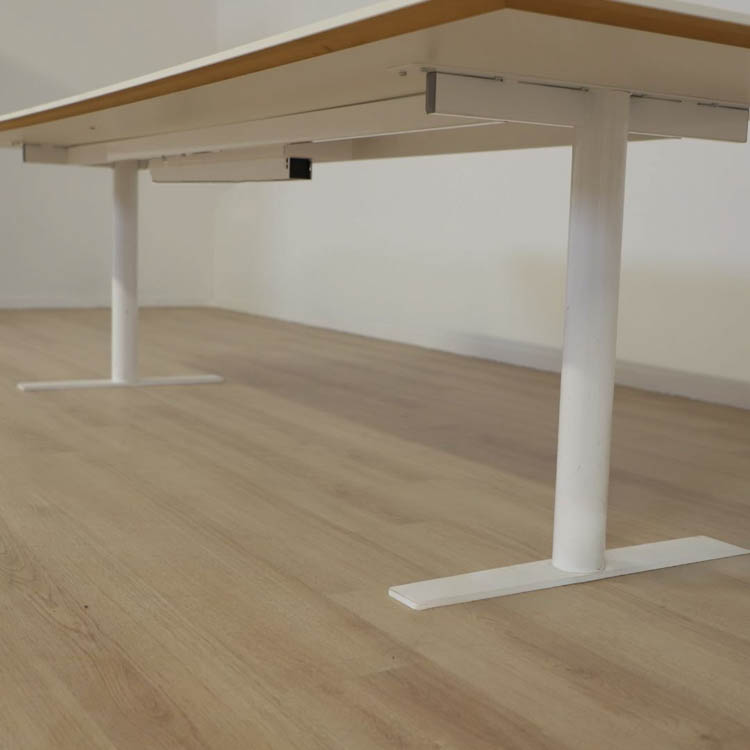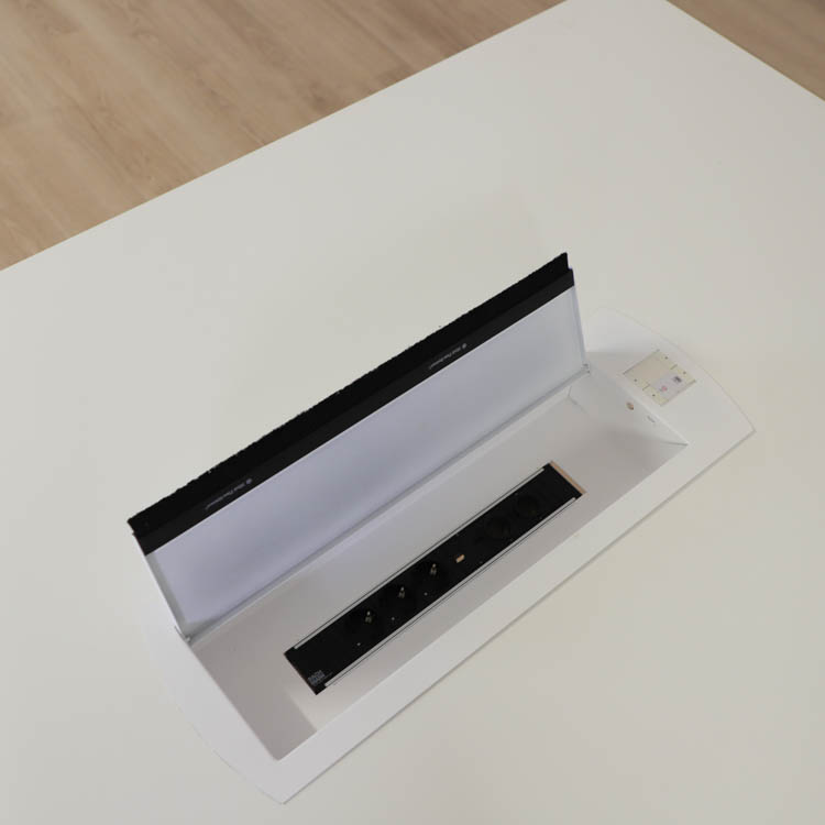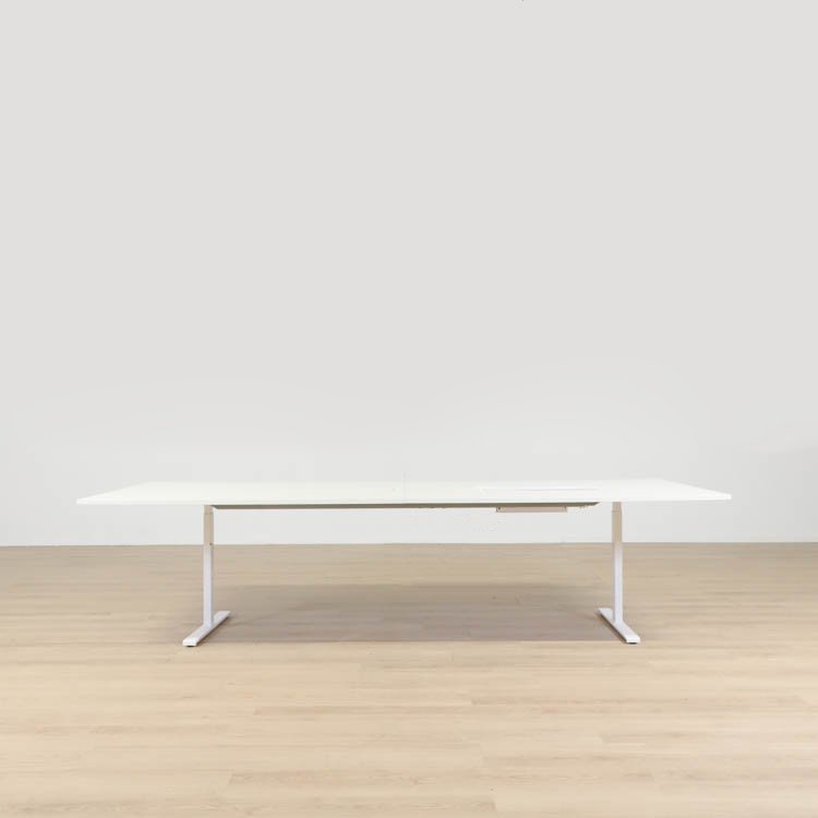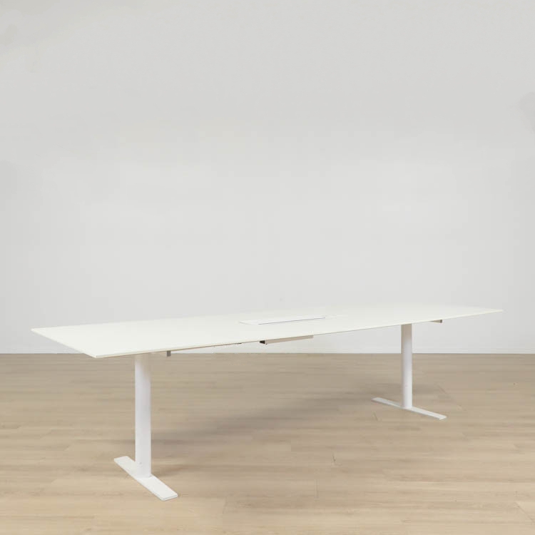 Bordet med måttet 420 cm har en tvådelad bordsskiva där det finns en integrerad powerbox på en sida av den tvådelade bordsskivan.
