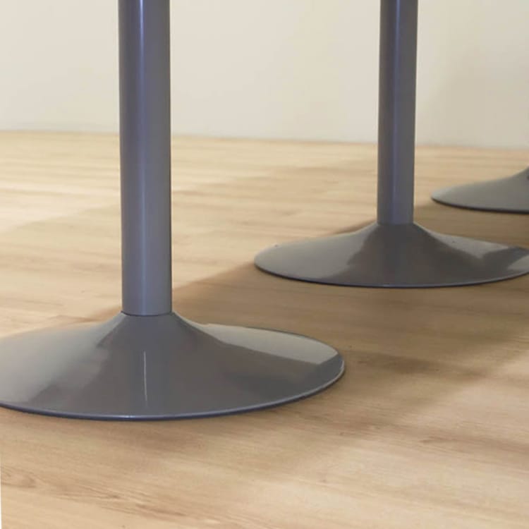 Skivorna är tillverkade av robust och lättskött laminat, vilket garanterar hållbarhet och enkelt underhåll. Varje av de tre sektionerna vilar på individuella grå trumpetstativ, vilket ger en imponerande hög stabilitet till bordet. För att möta förändrade behov av sittplatser kan bordet enkelt förlängas genom att lägga till fler iläggsskivor. Denna flexibilitet och strukturella noggrannhet gör Flexus till ett praktiskt och anpassningsbart val för konferensrum och mötesplatser där dynamiska mötesmiljöer krävs.