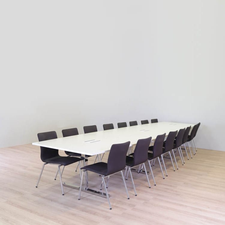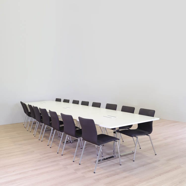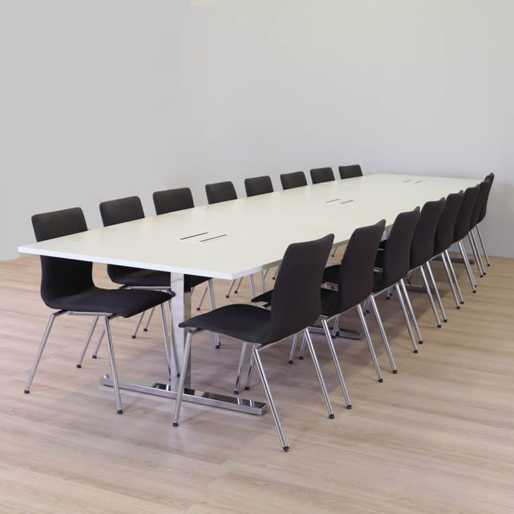 Konferensbordet Frankie med T-ben är ett stort bord med vit laminatskiva och kromat underrede. Materialvalet och dess formspråk gör att möbeln ger en hemtrevlig känsla på kontoret där många kan sitta tillsammans tack vare dess generösa storlek.