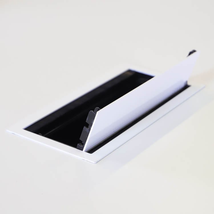 Bordsskivan är tredelad och är även utrustad med kabelboxar som diskret smälter in i bordsskivans vita kulör. Kabelluckorna är ett enkelt och snyggt sätt förvara elanslutning för att optimera arbetsytan. Serien Frankie är designad av Iiro Viljanen, en finsk inredningsarkitekt som genom åren gjort flertalet kollektioner för Martela med syftet att det ska vara trevligt att komma till sin arbetsplats.