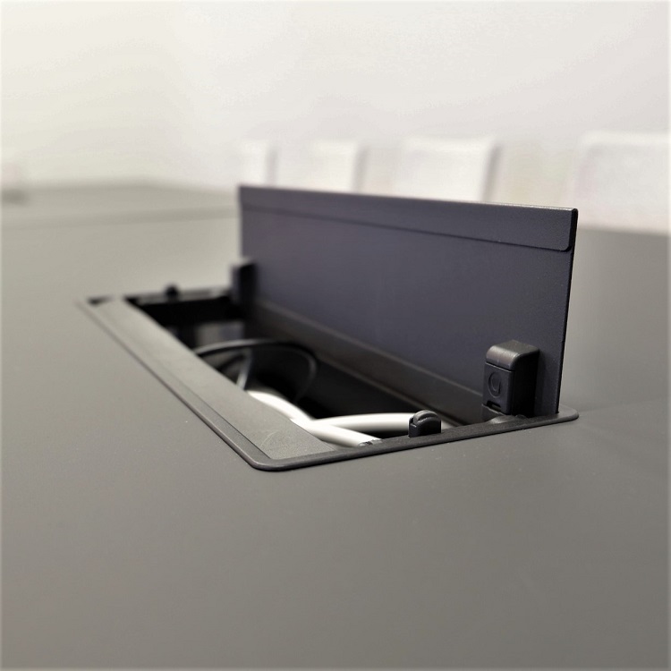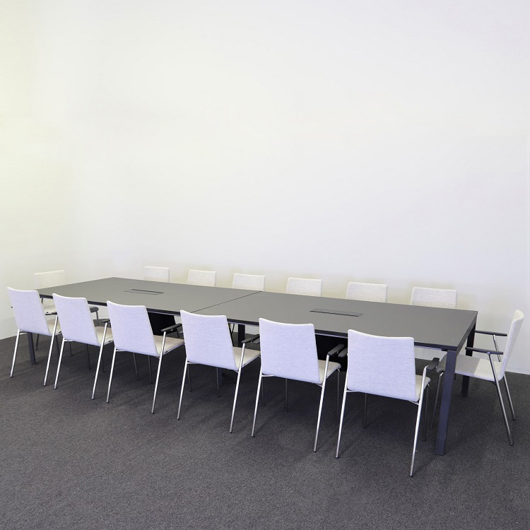 Den flexibla, tvådelade bordsskivan är utrustad med två kabelluckor med tillhörande kabelförvaring, vilket gör det enkelt att få undan kablar och sladdar från bordsskivan. Dess generösa storlek gör det enkelt att rymma alla mötesdeltagare runt bordet på såväl långsidor som kortsidor. Bordet rymmer 6 personer per långsida samt ytterligare 4 personer på kortsidorna, vilket ger ett antal sittplatser för 12 till 16 personer.