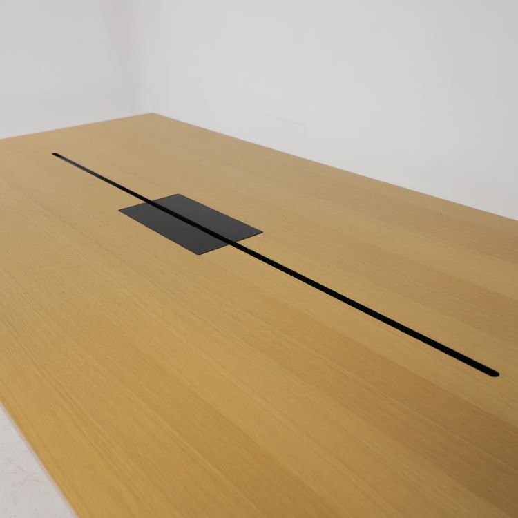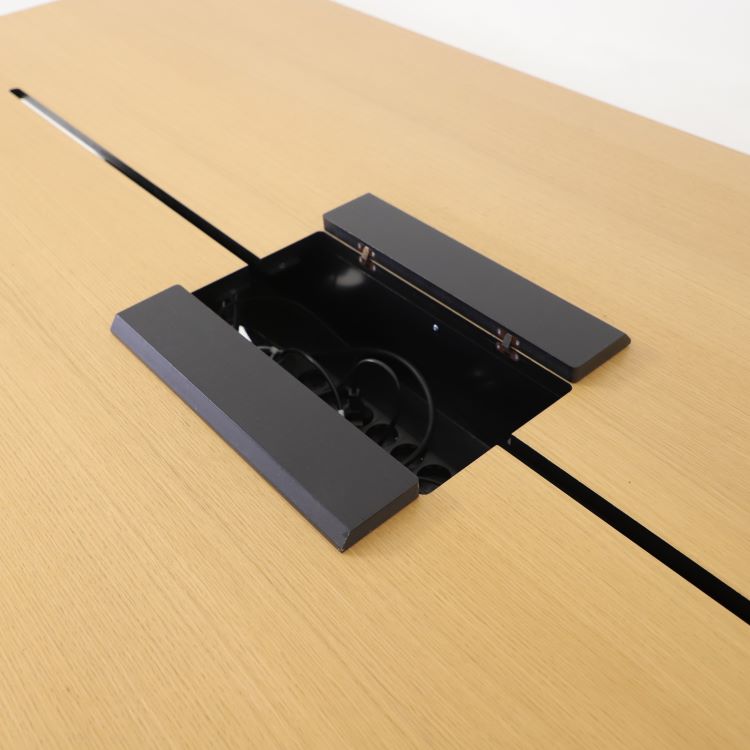 Högt konferensbord Piece från Edsbyn erbjuder generöst med arbetsutrymme samtidigt som den smidiga, integrerade kabelhanteringen gör det enkelt för alla runt bordet att hålla sig uppkopplade under mötet.