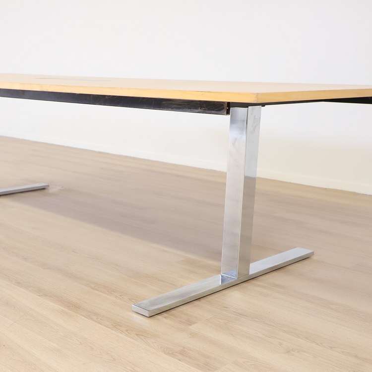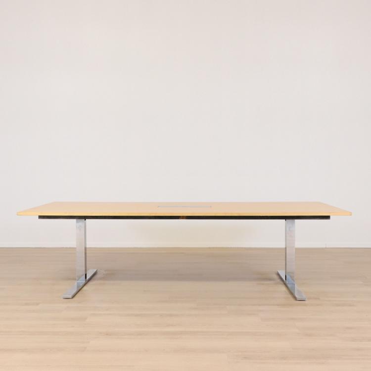 Det här konferensbord med en bordsskiva i trä och stilrena kromade ben är utformat med både stil och funktion i åtanke, vilket gör det till ett idealiskt val för företag som värdesätter både estetik och praktiska lösningar.