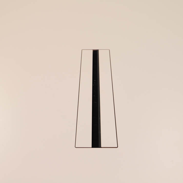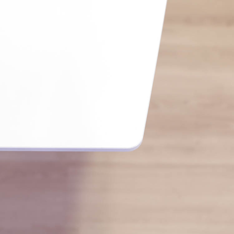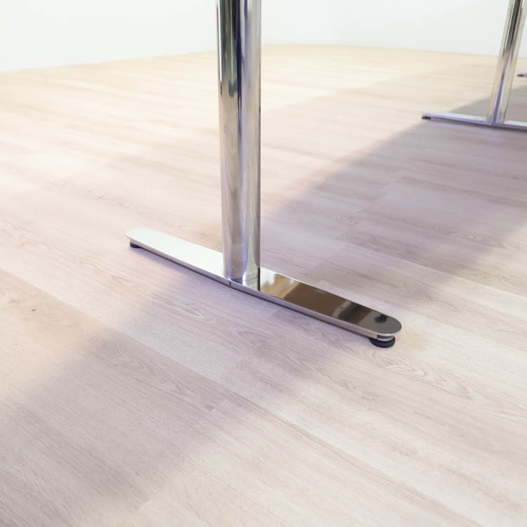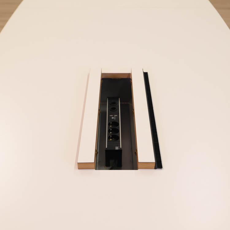Bordskivan är vit högtryckslaminat och stativet med T-form är i kromad stål. I bordskivan sitter två powerboxar med uttag för att enkelt kunna ansluta elektriska enheter, som döljs elegant under en lucka.