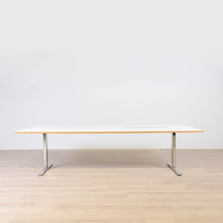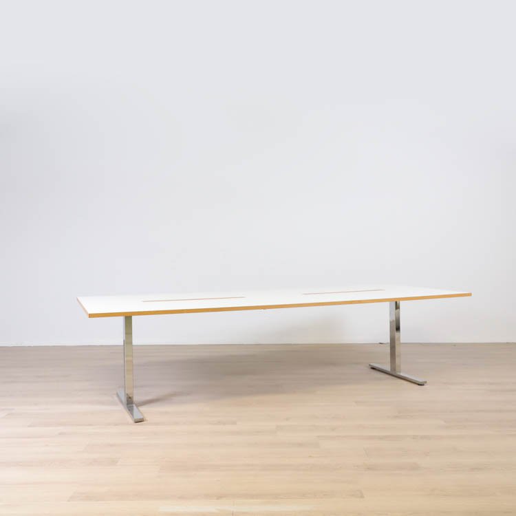 Rektangulärt konferensbord med vit skiva tillsammans med kromat t-stativ från Swedstyle. Utformad med två stycken kabelboxar för att kunna ansluta elektriska enheter på ett smidigt sätt.