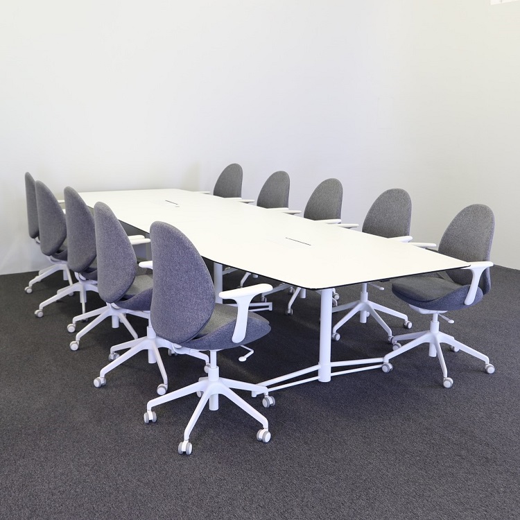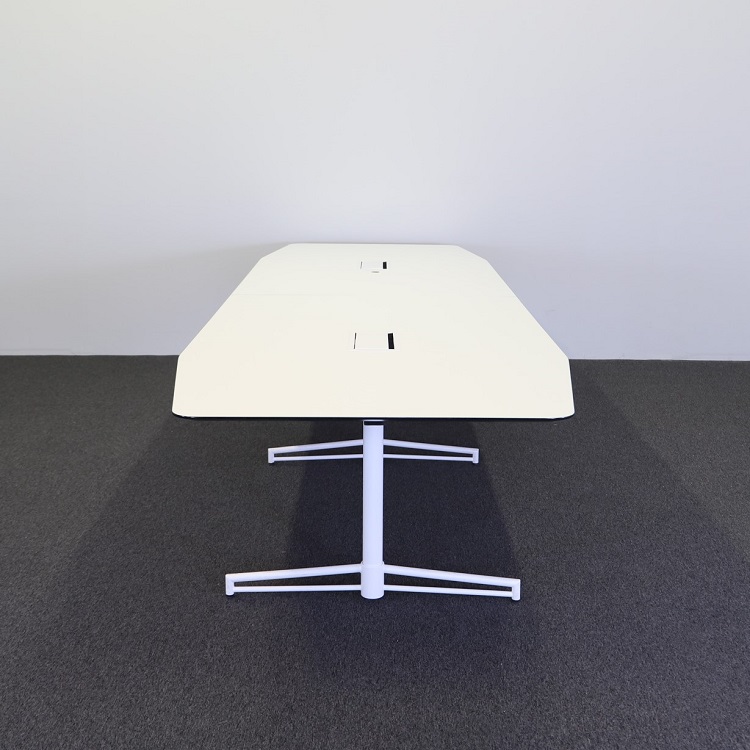 -Konferensbordet har en vit fasad skiva med svart kant, som utgör ett elegant och modernt val för konferensrummet. Den vita skivan ger ett rent och professionellt intryck samtidigt som den svarta kanten ger bordet en modern touch. De vita benen ger bordet dess enkla och luftiga utseende. Bordsskivan är utrustat med kabelkorg/kabellucka, där stickkontakt kan förvaras, för ett flexibelt möte där man slipper oönskade avbrott och irritationsmoment.