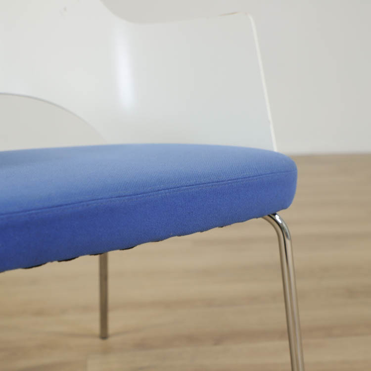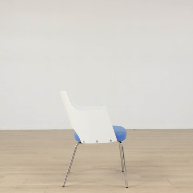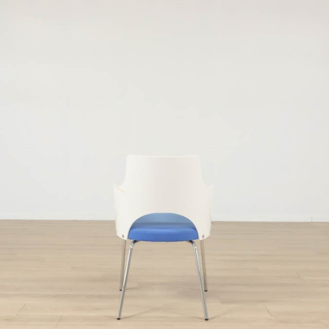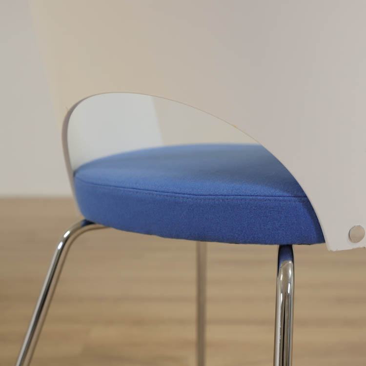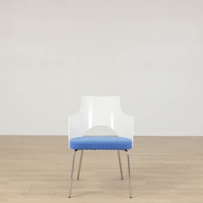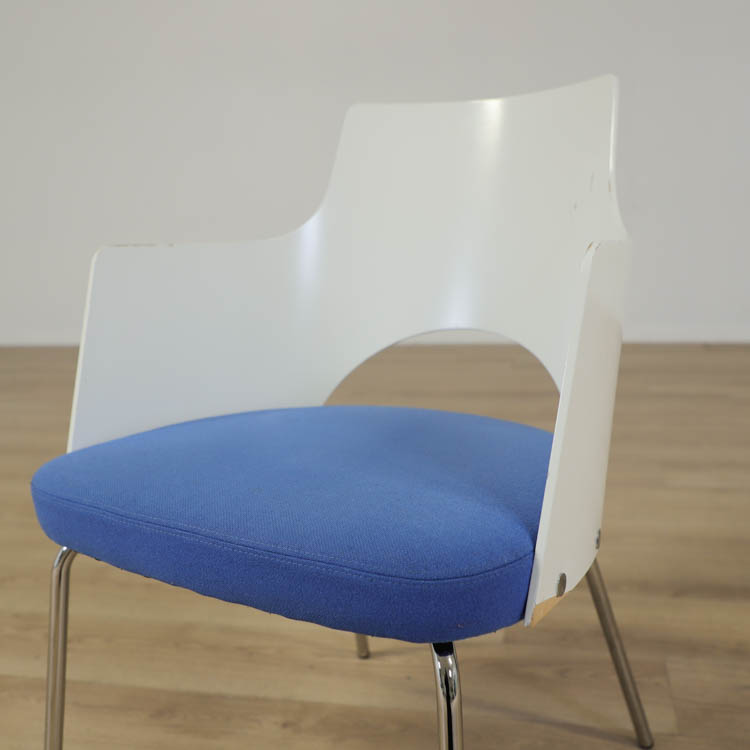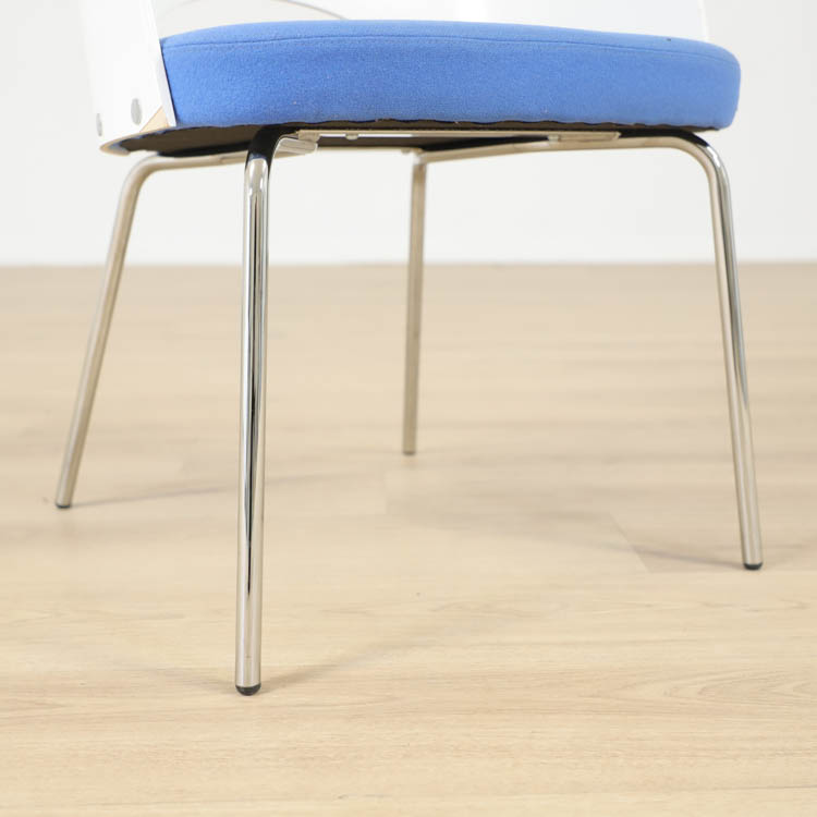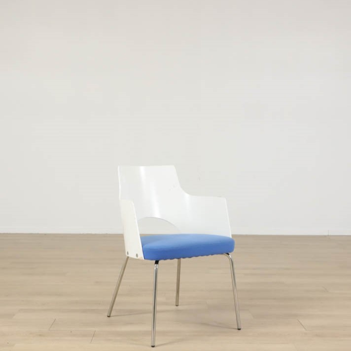 Karmstolen har kromade ben, formpressat skal och en härlig klädsel i blå. Designad av den framgångsrika designern Gunilla Allard.